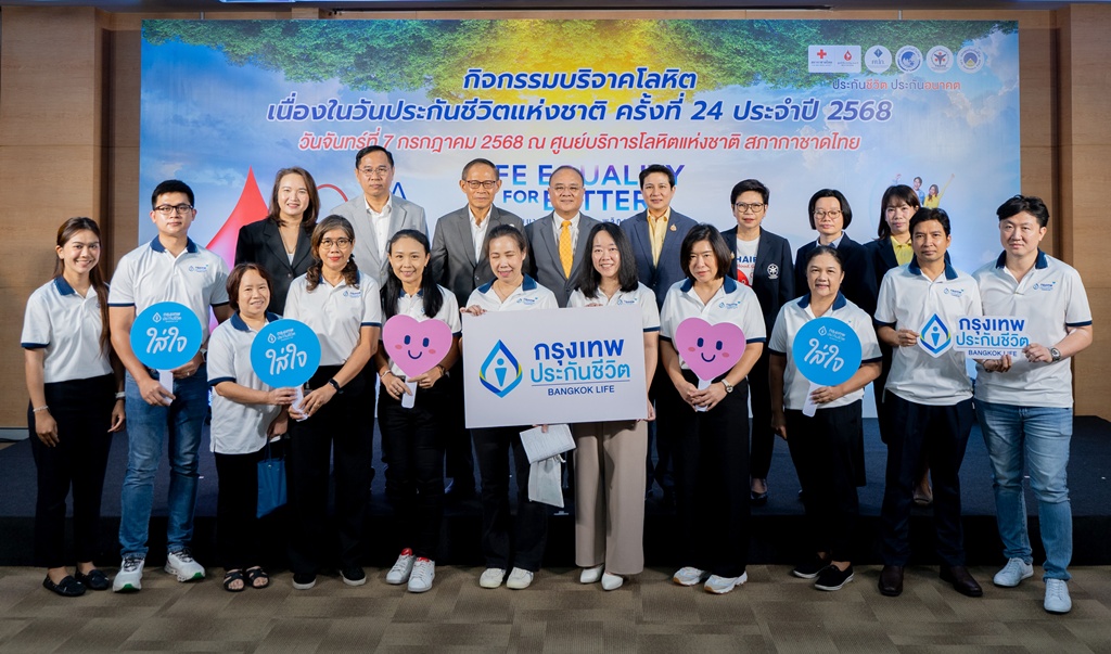 บริษัท กรุงเทพประกันชีวิต จำกัด (มหาชน) นำโดย นางสาวจารุวรรณ ลิ้มคุณธรรมโม ผู้ช่วยผู้จัดการใหญ่ สายบัญชีและการเงิน (ที่ 5 จากขวาล่าง) พร้อมด้วยพนักงานจิตอาสา สานต่อพันธกิจองค์กร “ใส่ใจสังคม” เข้าร่วมกิจกรรมบริจาคโลหิตเพื่อผู้ป่วยทั่วประเทศ เนื่องในวันประกันชีวิตแห่งชาติครั้งที่ 24 ประจำปี 2568 จัดโดยสำนักงานคปภ สมาคมประกันชีวิตไทย ที่จัดขึ้นเพื่อส่งเสริมการมีส่วนร่วมของภาคธุรกิจประกันชีวิตในการช่วยเหลือสังคมผ่านการบริจาคโลหิต ซึ่งเป็นโครงการที่กรุงเทพประกันชีวิตให้ความสำคัญและร่วมกิจกรรมเพื่อตอบแทนสังคมมาอย่างต่อเนื่องเป็นประจำทุกปี ณ ศูนย์บริการโลหิตแห่งชาติ สภากาชาดไทย เมื่อเร็ว ๆ นี้