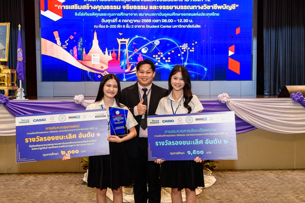 นักศึกษาคณะบัญชี มหาวิทยาลัยรังสิต คว้า 2 รางวัล โครงการประกวดสุนทรพจน์และเขียนเรียงความ “การเสริมสร้างคุณธรรม จริยธรรม และจรรยาบรรณทางวิชาชีพบัญชี” ครั้งที่ 12 ประกอบด้วย รางวัลรองชนะเลิศอันดับ 1 การประกวดสุนทรพจน์ และรางวัลรองชนะเลิศอันดับ 2 การแข่งเขียนเรียงความ ซึ่งจัดขึ้นโดยสมาคมสถาบันอุดมศึกษาเอกชนแห่งประเทศไทย ในพระราชูปถัมภ์ สมเด็จพระเทพรัตนราชสุดาฯ สยามบรมราชกุมารี มีวัตถุประสงค์เพื่อเสริมสร้างจิตสำนึกด้านคุณธรรม จริยธรรม และจรรยาบรรณทางวิชาชีพให้แก่นักศึกษาสาขาวิชาการบัญชี อีกทั้งยังเป็นเวทีสำคัญในการพัฒนาทักษะด้านการพูด การเขียน การคิดวิเคราะห์ และการทำงานเป็นทีมของนักศึกษา โดยในปีนี้มีนักศึกษาจากสถาบันการศึกษาต่าง ๆ เข้าร่วม 21 สถาบัน แบ่งเป็นการประกวดสุนทรพจน์ และการประกวดเขียนเรียงความ