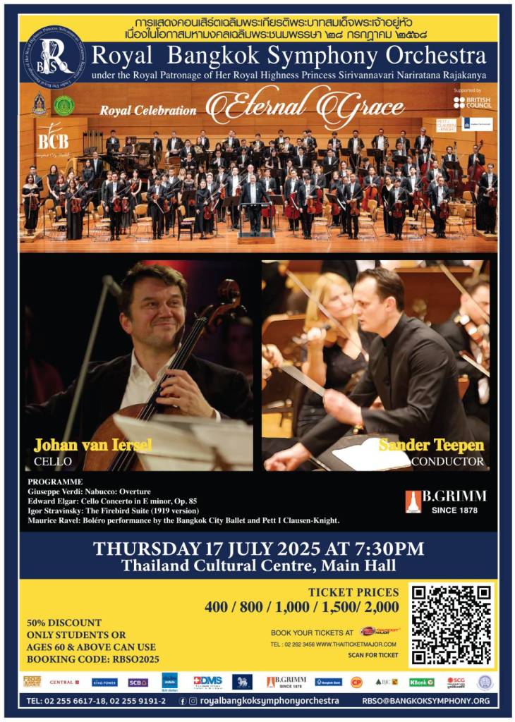 เนื่องในโอกาสวันเฉลิมพระชนมพรรษาของพระบาทสมเด็จพระเจ้าอยู่หัว ๒๘ กรกฎาคม ๒๕๖๘ มูลนิธิรอยัลแบงค์คอกซิมโฟนีออร์เคสตร้า ในพระอุปถัมภ์ของสมเด็จพระเจ้าลูกเธอ เจ้าฟ้าสิริวัณณวรีนารีรัตนราชกัญญา ร่วมกับกรมส่งเสริมวัฒนธรรม กระทรวงวัฒนธรรม ร่วมสนับสนุนโดย สถานเอกอัครราชทูตเนเธอแลนด์, Bristish Council และ บีกริม ขอเชิญชมการแสดงคอนเสิร์ตเฉลิมพระเกียรติ “Royal Celebration – Eternal Grace” บรรเลงโดย Royal Bangkok Symphony Orchestra ร่วมด้วยศิลปินเดี่ยวเปียโน Johan van Iersel อำนวยเพลงโดย Sander Teepen วาทยกรชาวดัตช์ ในวันพฤหัสบดี ๑๗กรกฎาคม ๒๕๖๘ เวลา ๑๙.๓๐ น. ณ หอประชุมใหญ่ ศูนย์วัฒนธรรมแห่งประเทศไทย