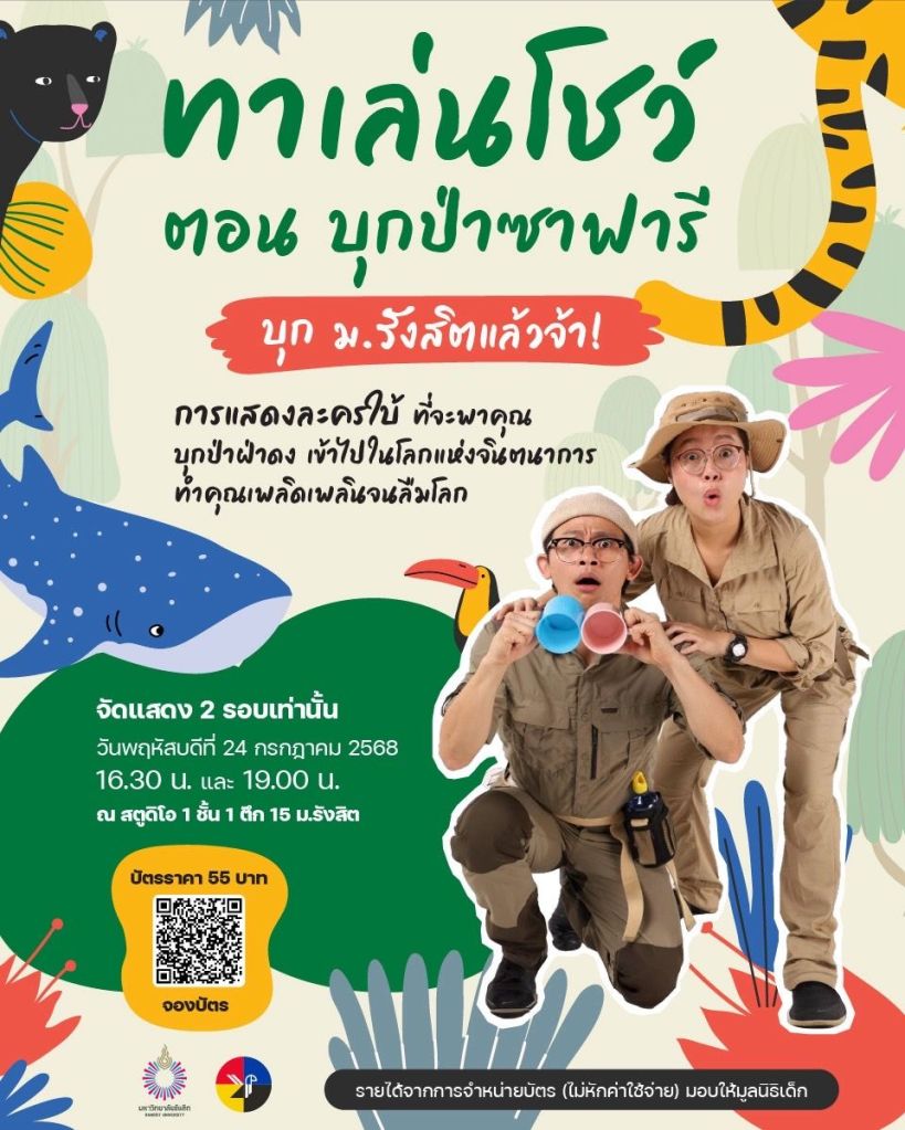 มหาวิทยาลัยรังสิต เชิญชวนผู้สนใจร่วมสัมผัสประสบการณ์สุดมหัศจรรย์กับการแสดงละครใบ้สุดสร้างสรรค์ “ทาเล่นโชว์ ตอน บุกป่าซาฟารี” ละครที่เดินสายจัดแสดงมาแล้วหลายประเทศ สร้างเสียงหัวเราะและแรงบันดาลใจให้กับผู้ชมทุกวัย พร้อมเปิดรอบการแสดงอย่างเป็นทางการในวันพฤหัสบดีที่ 24 กรกฎาคม 2568 โดยแบ่งการแสดงออกเป็น 2 รอบ ได้แก่ เวลา 16.30 น. และ 19.00 น. ณ สตูดิโอ 1 ชั้น 1 อาคาร Digital Multimedia Complex (อาคาร 15) มหาวิทยาลัยรังสิต
