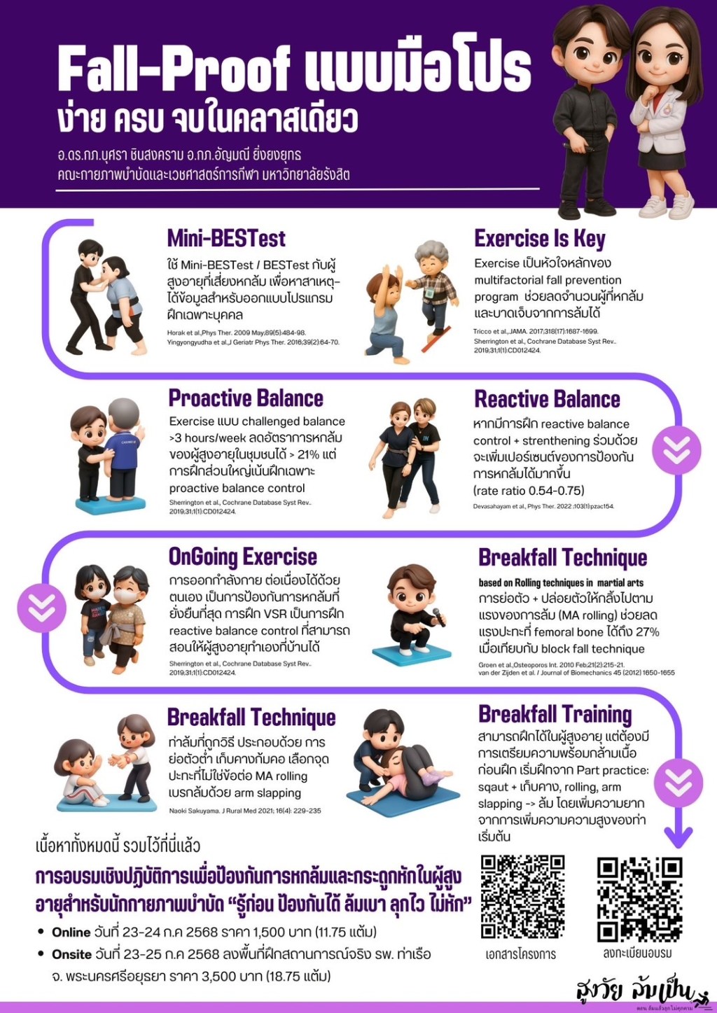 คณะกายภาพบำบัดและเวชศาสตร์การกีฬา มหาวิทยาลัยรังสิต จัดอบรมเชิงปฏิบัติการเพื่อป้องกันการหกล้มและกระดูกหักในผู้สูงอายุสำหรับนักกายภาพบำบัด “รู้ก่อน ป้องกันได้ ล้มเบา ลุกไว ไม่หัก” ในรูปแบบ Online ระหว่างวันที่ 23-24 กรกฎาคม 2568 ราคา 1,500 บาท (11.75 แต้ม) และรูปแบบ Onsite ระหว่างวันที่ 23-25 กรกฎาคม 2568 ลงพื้นที่ฝึกสถานการณ์จริง ณ โรงพยาบาลท่าเรือ จ.พระนครศรีอยุธยา ราคา 3,500 (18.75 แต้ม) วิทยากรโดย อ.ดร.กภ.บุศรา ชินสงคราม และ อ.กภ.อัญมณี ยิ่งยงยุทธ คณะกายภาพบำบัดและเวชศาสตร์การกีฬา มหาวิทยาลัยรังสิต