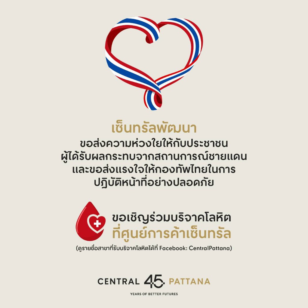 เซ็นทรัลพัฒนา ขอส่งความห่วงใยให้กับประชาชน ผู้ได้รับผลกระทบจากสถานการณ์ชายแดน และขอส่งแรงใจให้กองทัพไทยในการปฏิบัติหน้าที่อย่างปลอดภัย พร้อมกันนี้ ขอเชิญชวนประชาชนร่วมเป็นพลังแห่งการให้ ด้วยการบริจาคโลหิต ณ ศูนย์การค้าเซ็นทรัลสาขาใกล้บ้าน เพื่อช่วยต่อชีวิตและส่งต่อความหวังให้กับผู้ที่ต้องการความช่วยเหลืออย่างเร่งด่วนในช่วงเวลาสำคัญ