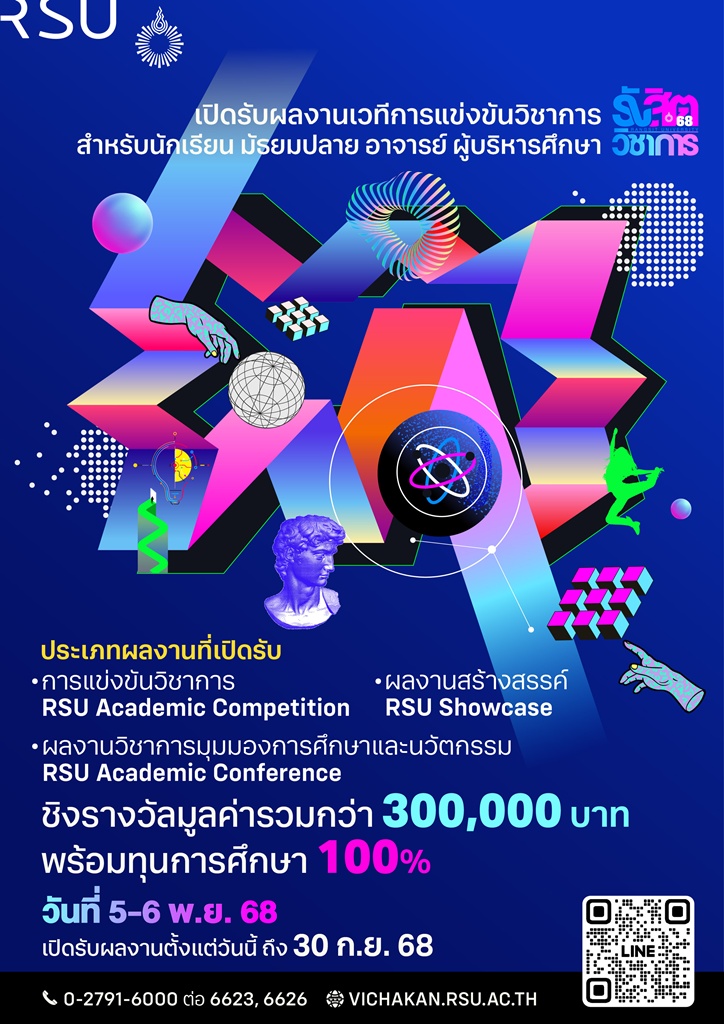 มหาวิทยาลัยรังสิต ขอเชิญนักเรียนมัธยมศึกษาตอนปลาย อาจารย์ ผู้บริหารสถานศึกษาทั่วประเทศ ร่วมส่งผลงานวิชาการเพื่อเข้าร่วมนำเสนอในงาน รังสิตวิชาการ ’68 ซึ่งจะจัดขึ้นระหว่างวันที่ 5-6 พฤศจิกายน 2568 โดยเปิดรับผลงานวิชาการดังนี้ ประเภทที่ 1 การแข่งขันวิชาการ (Academic Competition) ประเภทที่ 2 ผลงานวิชาการมุมมองการศึกษาและนวัตกรรม ( RSU Academic Conference) ประเภทที่ 3 ผลงานสร้างสรรค์ (RSU Showcase) เพื่อชิงรางวัลมูลค่ารวม 300,000 บาท และทุนการศึกษา