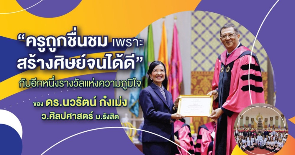ในพิธีไหว้ครู ประจำปี 2568 ของมหาวิทยาลัยรังสิต ซึ่งจัดขึ้นอย่างอบอุ่นและเปี่ยมด้วยความหมาย ได้มีการประกาศมอบรางวัลเชิดชูเกียรติให้แก่คณาจารย์ผู้มีบทบาทสำคัญในการสร้างแรงบันดาลใจ และผลักดันศิษย์ให้ก้าวไปสู่ความสำเร็จ หนึ่งในนั้นคือ ดร.นวรัตน์ ก๋งเม่ง อาจารย์ที่ปรึกษาชมรมดีเด่น จากชมรมออแกไนซ์ ผู้ได้รับเสียงชื่นชมจากทั้งศิษย์และเพื่อนร่วมงาน ผู้อุทิศตนและความทุ่มเทในการพัฒนากิจกรรมนักศึกษา อีกหนึ่งรางวัลแห่งความภูมิใจที่สะท้อนหัวใจของความเป็นครูอย่างแท้จริง
