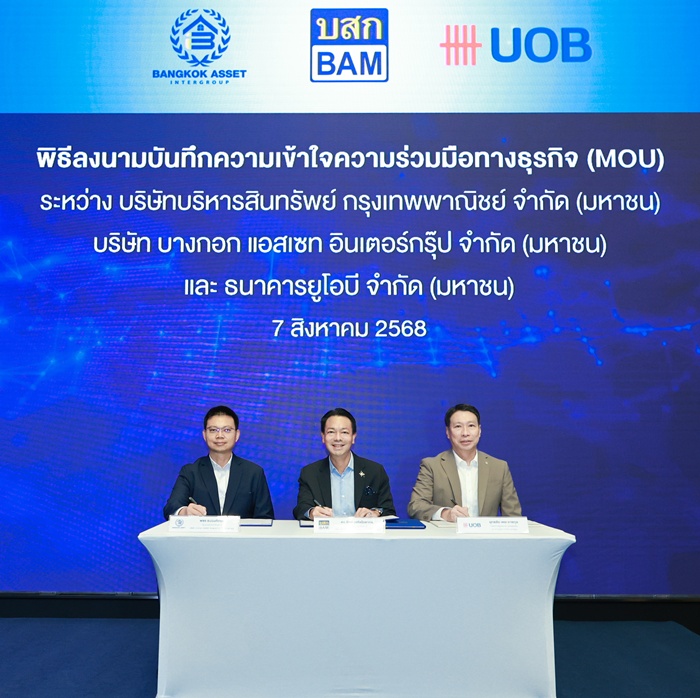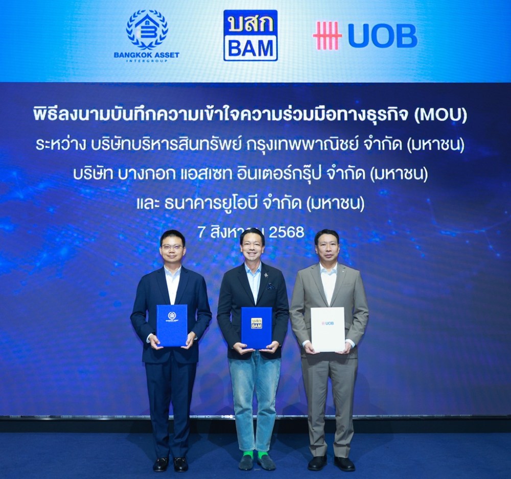 วันนี้ (7 ส.ค. 68) บริษัทบริหารสินทรัพย์ กรุงเทพพาณิชย์ จำกัด (มหาชน) (BAM) ได้ลงนามบันทึกข้อตกลงความร่วมมือทางธุรกิจ (MOU) กับ บริษัท บางกอก แอสเซท อินเตอร์กรุ๊ป จำกัด (มหาชน) (BKA) และ ธนาคารยูโอบี จำกัด (มหาชน) (UOB) เพื่อพลิกทรัพย์ร้างเป็นทรัพย์สร้างกำไร