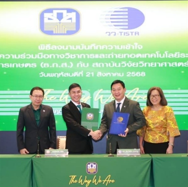 วันนี้ (21 สิงหาคม 2568) ธนาคารเพื่อการเกษตรและสหกรณ์การเกษตร (ธ.ก.ส.) ร่วมกับ สถาบันวิจัยวิทยาศาสตร์และเทคโนโลยีแห่งประเทศไทย (วว.) ลงนามบันทึกความเข้าใจ (MOU) ว่าด้วยความร่วมมือทางวิชาการและถ่ายทอดเทคโนโลยี เพื่อร่วมกันบูรณาการและถ่ายทอดองค์ความรู้ในด้านวิทยาศาสตร์ เทคโนโลยี นวัตกรรม ในการเพิ่มศักยภาพและความสามารถในการแข่งขันของเกษตรกรและผู้ประกอบธุรกิจในภาคการเกษตร โดยเฉพาะเกษตรกรรุ่นใหม่ ให้สามารถนำความรู้ไปใช้ประโยชน์ในการผลิต การแปรรูป การเพิ่ม ผลผลิต การตลาด ป้องกันบรรเทาปัญหาของเกษตรกร และการสร้างมูลค่าเพิ่มแก่ผลผลิตทางการเกษตร ส่งเสริมให้เกษตรกรใช้ประโยชน์จากงานบริการด้านวิทยาศาสตร์ และเทคโนโลยี รวมถึงการรับรองมาตรฐานการผลิต เพื่อสร้างความเข้มแข็งให้แก่เกษตรกรในการประกอบอาชีพเกษตรกรรมได้อย่างมั่งคงและยั่งยืน ซึ่ง ธ.ก.ส. จะสนับสนุนด้านการเข้าถึงแหล่งเงินทุน บริการทางการเงิน พร้อมด้วยองค์ความรู้การประกอบธุรกิจแก่เกษตรกรและผู้ประกอบการ โดยมีนายฉัตรชัย ศิริไล ผู้จัดการ ธ.ก.ส. และ ผศ.ดร.วีรชัย อาจหาญ ผู้ว่าการ วว. กระทรวงการอุดมศึกษา วิทยาศาสตร์ วิจัยและนวัตกรรม (อว.) เป็นผู้ลงนาม