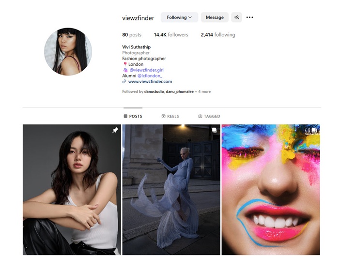 Portfolio ของวิว มีหลักๆ 2 ประเภท อันที่เป็นการถ่าย Fashion วิวใช้ชื่อว่า “VIEWZFINDER” หรือ Instagram @viewzfinder และ http://www.viewzfinder.com โดยวงการถ่ายภาพจะรู้จักวิวในชื่อ “วิว-สุทาทิพย์” หรือ Vivi Suthathip Viewzfinder จะเน้นการทำงานที่เป็นแฟชั่นมากๆ เน้นถ่ายนางแบบ และ Celebrity