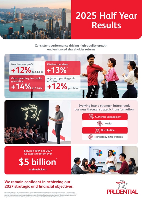 กลุ่มบริษัทพรูเด็นเชียล แถลงผลการดำเนินงานครึ่งปีแรก (สิ้นสุดวันที่ 30 มิ.ย. 68) รวมทั้งนำเสนอความคืบหน้าของแผนส่งมอบคุณค่าแก่ผู้ถือหุ้นอย่างต่อเนื่อง ภายใต้โครงการซื้อหุ้นคืนของบริษัทฯ สำหรับผลการดำเนินงานที่โดดเด่นในช่วงครึ่งปีแรกนั้น พรูเด็นเชียล มีผลกำไรธุรกิจใหม่ (New Business Profit) เติบโตเพิ่มขึ้น 12% เมื่อเทียบกับปีที่แล้ว อยู่ที่ 1,260 ล้านดอลลาร์สหรัฐ (ตามวิธีการคำนวณแบบ Traditional Embedded Value -TEV) บริษัทฯ มีกระแสเงินสดส่วนเกินจากธุรกิจประกันชีวิตที่ยังมีผลบังคับ และธุรกิจการจัดการสินทรัพย์ เพิ่มขึ้น 14% คิดเป็นมูลค่า 1,560ล้านดอลลาร์สหรัฐ