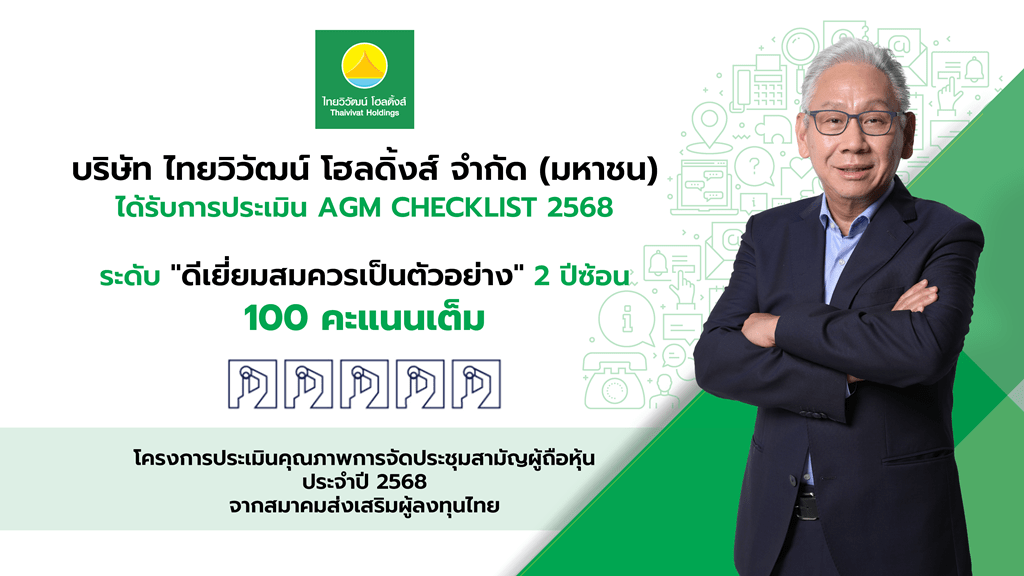 บริษัท ไทยวิวัฒน์ โฮลดิ้งส์ จำกัด (มหาชน) ตอกย้ำความมุ่งมั่นในการดำเนินธุรกิจด้วยหลักธรรมาภิบาลอันแข็งแกร่ง คว้าคะแนนประเมิน AGM Checklist เต็ม 100 คะแนน ติดต่อกัน 2 ปีซ้อน (2567 – 2568) ซึ่งจัดโดย สมาคมส่งเสริมผู้ลงทุนไทย ภายใต้ภารกิจที่ได้รับมอบหมายจากสำนักงานคณะกรรมการกำกับหลักทรัพย์และตลาดหลักทรัพย์ (ก.ล.ต.) สะท้อนถึงมาตรฐานการจัดประชุมผู้ถือหุ้นที่มีคุณภาพ โปร่งใส และเปิดกว้างตามหลักการกำกับดูแลกิจการที่ดี (Corporate Governance)
