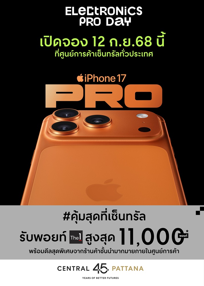 กรุงเทพฯ – ถ้าไม่จองที่เซ็นทรัล…บอกเลยว่าพลาดมาก!บริษัท เซ็นทรัลพัฒนา จำกัด (มหาชน) พร้อมพาสาวกแอปเปิ้ลสัมผัสประสบการณ์เป็นเจ้าของ iPhone 17 Series ก่อนใคร กับแคมเปญ “Electronics Pro Day 2025” ที่ยกทัพพันธมิตรตัวจริง iStudio by Copperwired, iStudio by SPVi, Studio7, Apple Store, dotlife, TG, Advice, IT CITY, JAYMART, BaNANA, Power Buy, AIS, TRUE และอีกมากมาย มามอบข้อเสนอที่ดีที่สุดให้ครบในที่เดียวเริ่ม 12 กันยายน – 9 พฤศจิกายน 2568