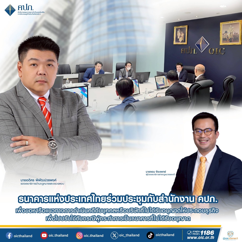 เมื่อวันที่ 28 สิงหาคม 2568 สำนักงาน คปภ. โดยนายอดิศร พิพัฒน์วรพงศ์ รองเลขาธิการ ด้านกฎหมายและตรวจสอบ และนายจอม จีระแพทย์ ผู้ช่วยเลขาธิการสายกฎหมายและคดี ได้กล่าวต้อนรับคณะผู้แทนจากธนาคารแห่งประเทศไทย พร้อมร่วมสนทนาและกล่าวถึงหลักการ วิธีการดำเนินงานของสำนักงาน คปภ. กรณีดำเนินคดีกับผู้กระทำการประกอบธุรกิจประกันภัยโดยไม่ได้รับอนุญาตและกรณีผู้กระทำการเป็นคนกลางประกันภัยโดยไม่ได้รับอนุญาต ซึ่งทั้ง 2 หน่วยงานได้มีการแลกเปลี่ยนองค์ความรู้ บูรณาการข้อมูลร่วมกันเกี่ยวกับแนวทางในการดำเนินคดีตามกฎหมาย ยกระดับการกำกับดูแลภาคธุรกิจ และการคุ้มครองผู้บริโภคให้มีประสิทธิภาพผ่านมาตรการทางกฎหมาย