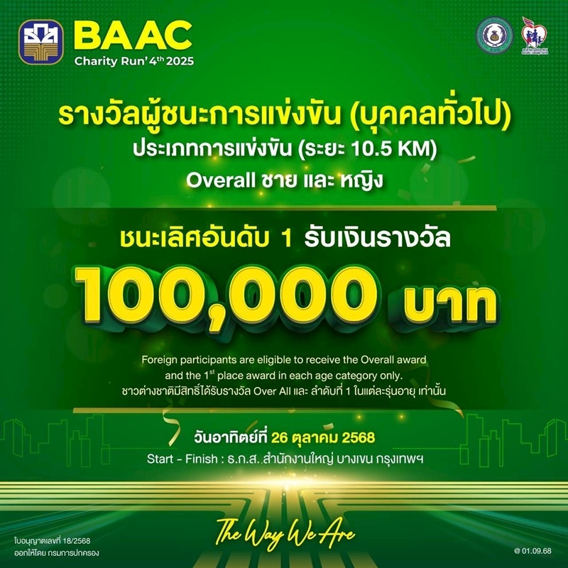 ประเภทการแข่งขันระยะ 10.5 กม. ผู้ชนะการแข่งขัน (บุคคลทั่วไป) Overall ชาย และ หญิง อันดับที่ 1 จะได้รับเงินรางวัลสูงถึง 1 แสนบาท พร้อมตุ๊กตาด้วงน้อย รุ่น Limited Edition ได้ที่เว็บไซต์ ThaiRun https://race.thai.run/baaccharityrun2025 หรือ https://baaccharityrun.com ทั้งนี้ ส.ธกส. ขอสงวนสิทธิ์ปิดรับสมัครก่อนกำหนด หากมีผู้สมัครเต็มจำนวน 4,000 คน และเปิดให้ผู้สมัครรับเสื้อวิ่งได้ด้วยตัวเอง ณ ชั้น 1 อาคาร โพเดียม ธ.ก.ส. สำนักงานใหญ่ บางเขน กรุงเทพฯ ในระหว่างวันที่ 24 – 25 ตุลาคม 2568 เวลา 08.00 – 16.00 น.ดูรายละเอียดเพิ่มเติมได้ที่ Facebook : ธกส BAAC Thailand และ BAAC Charity Run หรือโทรสอบถาม Call Center โทร 02 555 0555