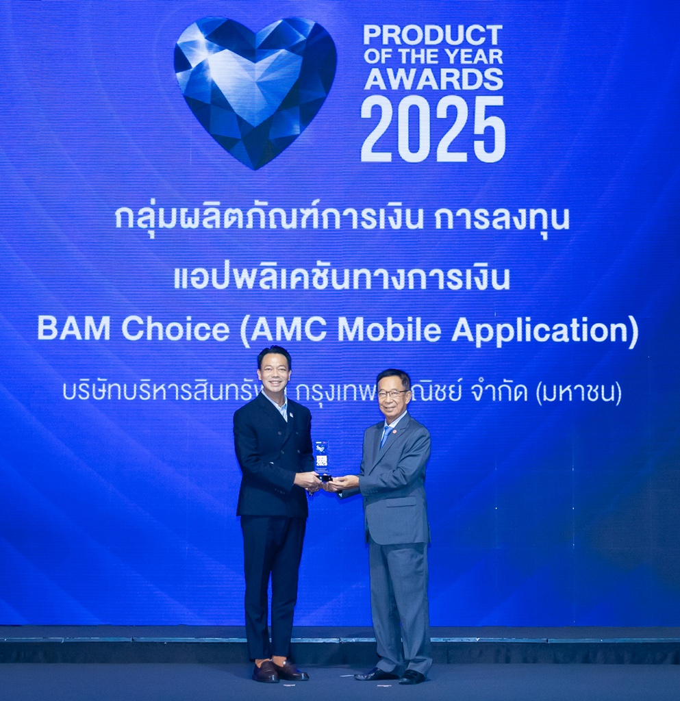 ดร.รักษ์ วรกิจโภคาทร ประธานเจ้าหน้าที่บริหาร บริษัทบริหารสินทรัพย์ กรุงเทพพาณิชย์ จำกัด (มหาชน) หรือ BAM เข้ารับรางวัล BUSINESS+ PRODUCT OF THE YEAR AWARDS 2025 ในกลุ่มสินค้าและบริการประเภทการเงิน-การลงทุน AMC Mobile Application จาก ฯพณฯ นุรักษ์ มาประณีต องคมนตรี ตอกย้ำ
