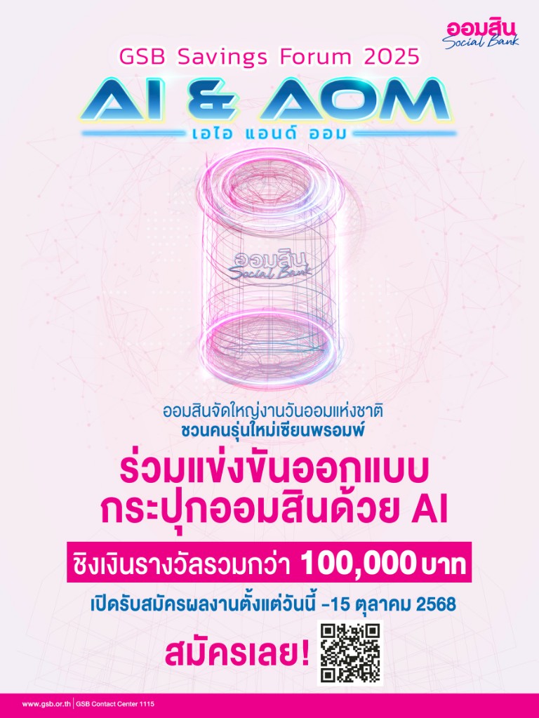 ธนาคารออมสิน เตรียมจัดงานใหญ่ GSB SAVINGS FORUM 2025 เนื่องในวันออมแห่งชาติ 31 ตุลาคม 2568 ภายใต้แนวคิด “AI & AOM ออมยุคใหม่ สร้างสังคมไทยให้ยั่งยืน” เพื่อเปิดเวทีแลกเปลี่ยนความคิดและประสบการณ์ด้านการออมในโลกดิจิทัล สะท้อนการผสานพลัง “AI” (Artificial Intelligence) เข้ากับ “AOM” (การออม) ในการสร้างวินัยทางการเงินและสังคมแห่งการออมที่ยั่งยืน หนึ่งในไฮไลท์สำคัญคือ กิจกรรมประกวดออกแบบ “กระปุกออมสินแห่งโลกยุคดิจิทัล” เชิญชวนคนรุ่นใหม่ร่วมสร้างสรรค์งานออกแบบผ่าน AI Generative Tools ถ่ายทอดแนวคิดการออมในมิติใหม่ พร้อมชิงเงินรางวัลมูลค่ารวม 110,000 บาท ตอกย้ำภารกิจสำคัญของธนาคารในการส่งเสริมการออมและสร้างวินัยทางการเงินอย่างต่อเนื่อง
