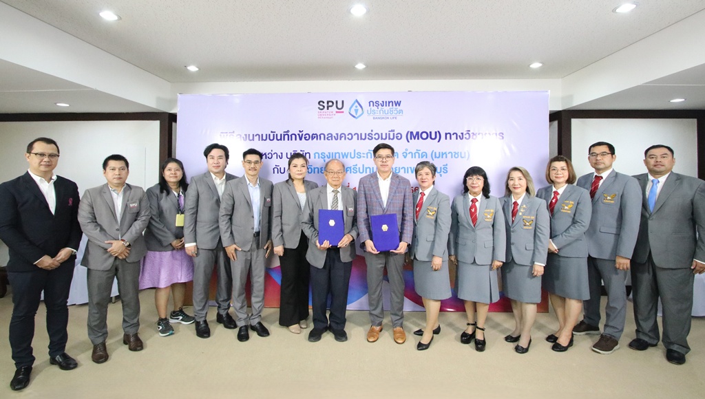 บริษัท กรุงเทพประกันชีวิต จำกัด (มหาชน) นำโดย นายจักรพงศ์ แสงแก้ว ผู้ช่วยผู้จัดการใหญ่ สายงานตัวแทนและที่ปรึกษาทางการเงิน (ที่ 8 จากซ้าย) ลงนามบันทึกข้อตกลงความร่วมมือ (MOU) ทางวิชาการกับ มหาวิทยาลัยศรีปทุม วิทยาเขตชลบุรี โดย ผู้ช่วยศาสตราจารย์ ดร.สุเทพ อุสาหะ ผู้ช่วยอธิการบดี มหาวิทยาลัยศรีปทุม วิทยาเขตชลบุรี (ที่ 7 จากซ้าย) ในโครงการ Mini MBA Certified BLA & SPUC Leader 2025: Entrepreneurial Leaders of the New Era Transform Your Leadership, Transform Your Future โดยมีผู้บริหารฝ่ายขายระดับสูง ภาคตะวันออก ร่วมเป็นสักขีพยาน ซึ่งการลงนามบันทึกข้อตกลงในครั้งนี้ จัดทำขึ้นเพื่อพัฒนาศักยภาพผู้บริหารตัวแทนให้มีทักษะเชิงผู้ประกอบการ ตลอดจนการเสริมสร้างองค์ความรู้ด้านการบริหารธุรกิจและภาวะผู้นำ สร้างแนวคิดเชิงนวัตกรรมและการบริหารจัดการอย่างยั่งยืน โดยมุ่งเน้นความสำคัญของการพัฒนาทักษะเชิงผู้ประกอบการ ภาวะผู้นำ และการใช้เทคโนโลยี AI ในการเสริมสร้างศักยภาพผู้บริหารตัวแทนให้เป็นเจ้าของกิจการที่สามารถขับเคลื่อนธุรกิจประกันชีวิตได้อย่างยั่งยืน ณ มหาวิทยาลัยศรีปทุม วิทยาเขตชลบุรี เมื่อเร็วๆ นี้