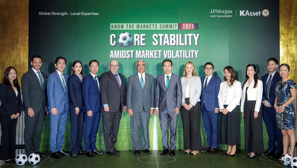 บริษัทหลักทรัพย์จัดการกองทุน กสิกรไทย จำกัด (บลจ.กสิกรไทย) ร่วมกับพันธมิตรระดับโลก J.P. Morgan Asset Management จัดงานสัมมนาการลงทุนสุดยิ่งใหญ่แห่งปี “Know The Markets Summit 2025: Core Stability Amidst Market Volatility” โดยได้รับเกียรติจาก Mr. Ayaz Ebrahim CEO for Singapore and Southeast Asia, J.P. Morgan Asset Management (ที่ 7 จากซ้าย) และนายวิน พรหมแพทย์, CFA ประธานกรรมการบริหาร บลจ.กสิกรไทย (ที่ 7 จากขวา) นำทีมผู้เชี่ยวชาญด้านการลงทุนจากทั้ง 2 บริษัท มาร่วมถ่ายทอดมุมมองเศรษฐกิจและกลยุทธ์การลงทุนสำหรับปี 2026 เพื่อเสริมสร้างความมั่นใจให้กับผู้ลงทุนไทยในการเตรียมรับมือกับความไม่แน่นอนของเศรษฐกิจโลก