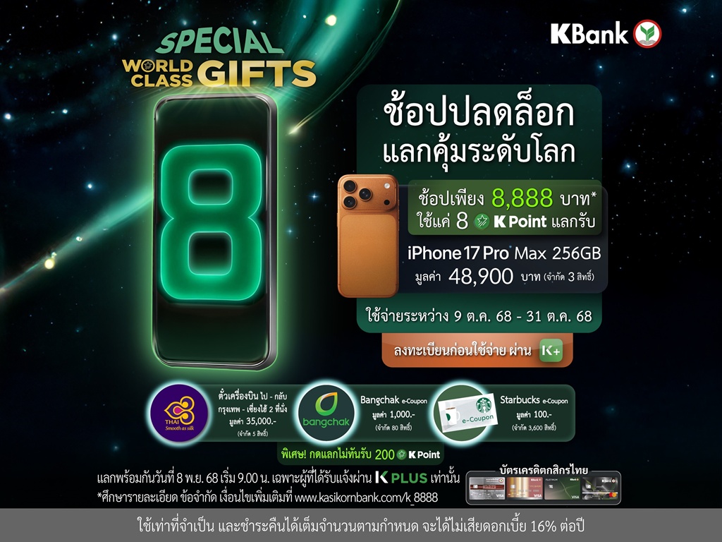 ทั้งนี้ หากพลาดในช่วงแคมเปญข้างต้น สามารถติดตามเซอร์ไพรส์ใหม่ของ Special WORLD CLASS GIFTS: ช้อปปลดล็อก แลกคุ้มระดับโลก* กับบัตรเครดิตกสิกรไทยได้อีกครั้ง โดยลงทะเบียนก่อนใช้จ่ายผ่าน K PLUS และใช้จ่ายสะสมผ่านบัตรเครดิตกสิกรไทย ครบ 8,888 บาท* ในหมวดสินค้าที่ร่วมรายการ ระหว่างวันที่ 1 พฤศจิกายน 2568 – 30 พฤศจิกายน 2568 และแลกรับสินค้าได้ในวันที่ 8 ธันวาคม 2568 เวลา 9.00 น.