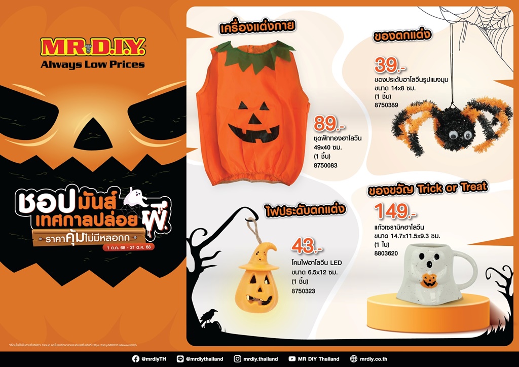 คุณอานุภาพ คงมาลัย รองประธานบริหารฝ่ายการตลาด บริษัท มิสเตอร์. ดี.ไอ.วาย. โฮลดิ้ง (ประเทศไทย) จำกัด (มหาชน) กล่าวว่า “ฮาโลวีนเป็นอีกหนึ่งเทศกาลที่เต็มไปด้วยความคึกคักและสีสันที่ได้รับความนิยมทั่วโลก เสน่ห์ของเทศกาลนี้อยู่ที่การแต่งกายในธีมแฟนซีและการตกแต่งสถานที่ ที่ช่วยสร้างบรรยากาศแห่งความสนุกสนานและความสุขให้กับทุกคนในครอบครัว เราจะเห็นการจัดกิจกรรมในหลายพื้นที่ ไม่ว่าจะเป็นโรงเรียน สถานที่ทำงาน หรือแม้แต่งานอีเวนต์ต่างๆ ซึ่งดึงดูดทั้งเด็กและผู้ใหญ่ให้เข้าร่วมอย่างสนุกสนานเพื่อร่วมเติมเต็มบรรยากาศแห่งความสนุกในปีนี้ มิสเตอร์. ดี.ไอ.วาย. ได้คัดสรรและขนทัพสินค้าไฮไลต์ฮาโลวีน “ชอปมันส์เทศกาลปล่อยผี ราคาคุ้มไม่มีหลอก” กว่า 130 รายการ อาทิ ของประดับฮาโลวีนรูปแมงมุม ราคา 39 บาท โคมไฟฮาโลวีน LED ราคา 43 บาท ชุดฟักทองฮาโลวีน ราคา 89 บาท และแก้วเซรามิกฮาโลวีน ราคา 149 บาท ณ ร้านมิสเตอร์. ดี.ไอ.วาย. สาขาที่ร่วมรายการ ซึ่งพร้อมมอบประสบการณ์ชอปปิงที่สะดวกสบายในราคาถูกคุ้มเสมอ (Always Low Prices) เพื่อให้ตอบโจทย์ทุกความต้องการของลูกค้าในการสร้างบรรยากาศฮาโลวีนได้อย่างเพลิดเพลินและสนุกกันได้เต็มที่”นอกจากนี้ มิสเตอร์. ดี.ไอ.วาย. ยังได้จัดกิจกรรมพิเศษ “ชอป แล้ว โชว์” ลูกค้ามีสิทธิ์ร่วมชิงรางวัล iPhone 17 Pro ถึง 5 เครื่อง พร้อมบัตรของขวัญ MR. D.I.Y. รวมมูลค่ากว่า 300,000 บาท เพียงซื้อสินค้าที่ร้านมิสเตอร์. ดี.ไอ.วาย. ครบ 300 บาท/ใบเสร็จ และถ่ายภาพโชว์ไอเดีย โพสท่าสุดเก๋ คู่กับสแตนดี้ “ปันดี” ที่ร้านมิสเตอร์. ดี.ไอ.วาย. สาขาที่ร่วมรายการ หรือหุ่นมาสคอต “ปันดี” ณ ร้านมิสเตอร์. ดี.ไอ.วาย. สาขาศูนย์การค้าซีคอนสแควร์ ศรีนครินทร์ และสาขาเดอะมอลล์ ไลฟ์สโตร์ บางกะปิ พร้อมเขียนข้อความบอกเล่าเรื่องราวดีๆ ที่เจอที่ร้านมิสเตอร์. ดี.ไอ.วาย.