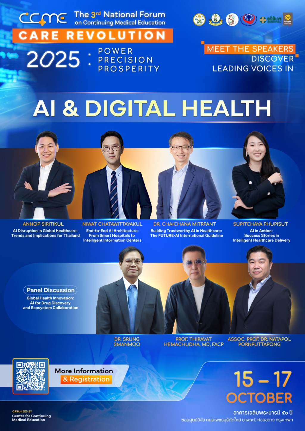 ภายในงานพบกับผู้เชี่ยวชาญชั้นนำด้านปัญญาประดิษฐ์และนวัตกรรมสุขภาพ ที่จะมาแบ่งปันแนวคิดและประสบการณ์จริงในยุคการแพทย์ดิจิทัล เวทีสำคัญในการอัปเดตความรู้ เทคโนโลยี และนวัตกรรมทางการแพทย์ เพื่อยกระดับมาตรฐานการดูแลผู้ป่วยให้เทียบเท่าสากล ฯลฯ