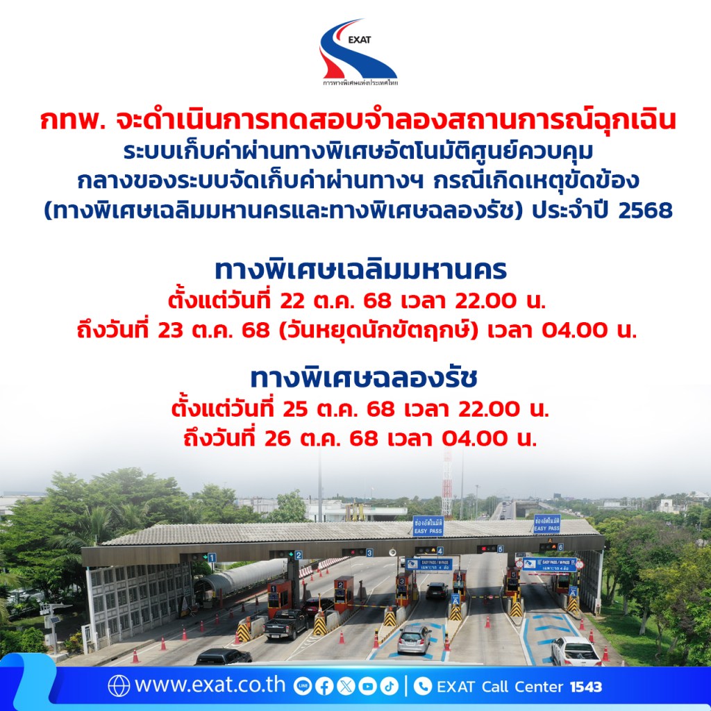 - ทางพิเศษฉลองรัช ตั้งแต่วันที่ 25 ตุลาคม 2568 เวลา 22.00 น. ถึงวันที่ 26 ตุลาคม 2568 เวลา 04.00 น. ซึ่งจะเกิดผลกระทบกับการส่งข้อมูลระบบเก็บค่าผ่านทางอัตโนมัติของทางพิเศษฉลองรัช ทำให้ยอดเงินสำรองค่าผ่านทางในบัตร Easy Pass แสดงผลล่าช้าในวันที่ 26 ตุลาคม 2568 ช่วงเวลา 00.00-03.00 น.