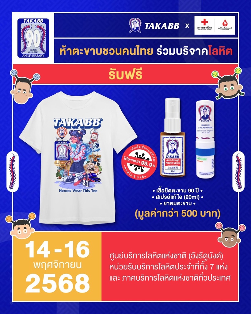 เนื่องในโอกาสครบรอบ 90 ปี แห่งการเคียงข้างสังคมไทย ห้าตะขาบ ผู้ผลิตยาอมแก้ไอ ตราตะขาบ 5 ตัว อันเป็นที่รู้จักและได้รับความไว้วางใจมายาวนาน ขอเชิญชวนประชาชนคนไทยร่วมเป็นส่วนหนึ่งของพลังแห่งการให้ ในกิจกรรม บริจาคโลหิตครั้งใหญ่ เพื่อสำรองโลหิตให้กับผู้ป่วยทั่วประเทศ