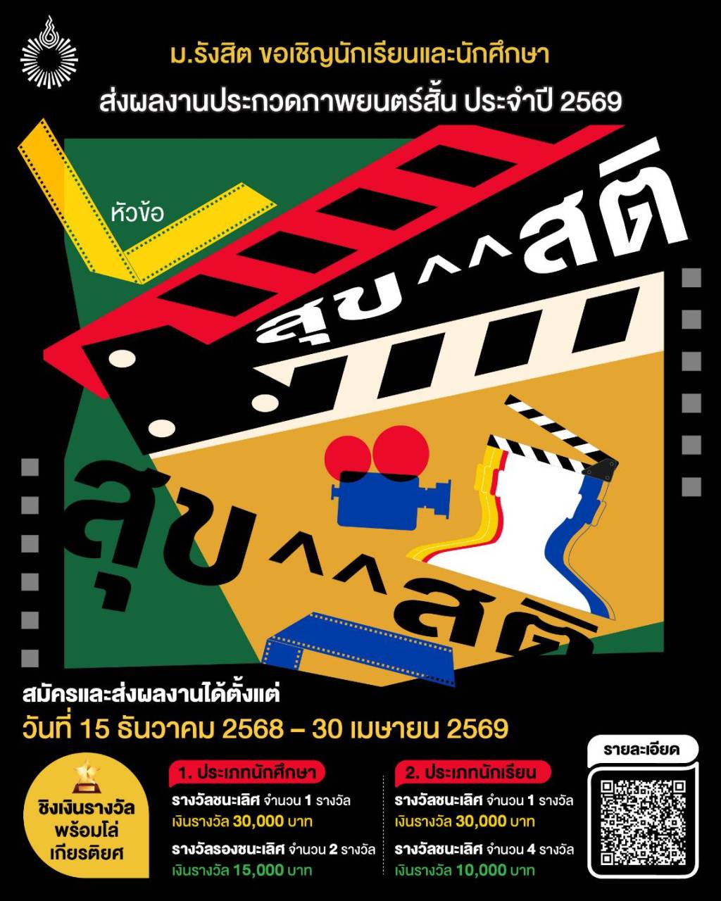 มหาวิทยาลัยรังสิต ขอเชิญชวน นักศึกษา และนักเรียน ส่งผลงานเข้าร่วมการประกวดภาพยนตร์สั้นเพื่อการส่งเสริมคุณธรรมจริยธรรม ประจำปี พ.ศ. 2569 ภายใต้หัวข้อ “สุข ^^ สติ” โดยแบ่งเป็นประเภทนักเรียนและนักศึกษา ชิงเงินรางวัล พร้อมโล่เกียรติยศ โดยมีวัตถุประสงค์เพื่อเป็นการเสริมสร้าง สนับสนุน คุณธรรม จริยธรรม ค่านิยม มิติทางจิตใจอันดีงาม การมีวินัย จิตอาสา ความกตัญญู พอเพียง สุจริต และเข้าใจคุณค่าในตัวเองอย่างมีสติ ส่งผลต่อเนื่องถึงสังคมที่เข้มแข็งขึ้น