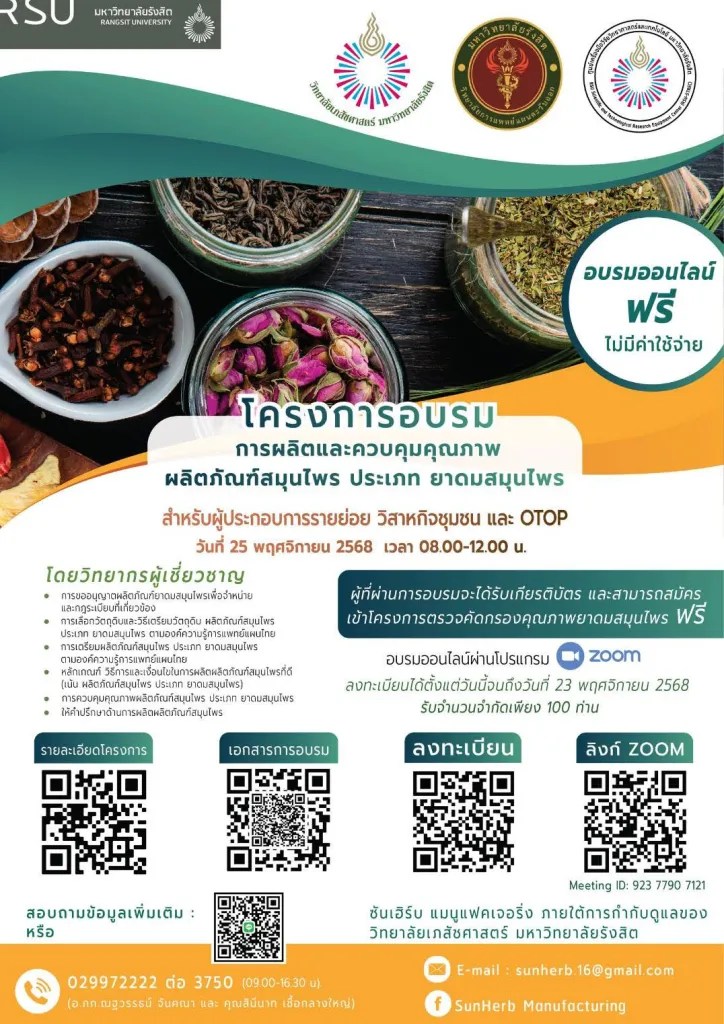 ศูนย์เครื่องมือวิจัยวิทยาศาสตร์และเทคโนโลยี ศูนย์มาตรฐานฮาลาล วิทยาลัยเภสัชศาสตร์ และวิทยาลัยการแพทย์แผนตะวันออก มหาวิทยาลัยรังสิต จัดโครงการอบรม “การผลิตและควบคุมคุณภาพผลิตภัณฑ์สมุนไพร ประเภทยาดมสมุนไพร” สำหรับผู้ประกอบการรายย่อย วิสาหกิจชุมชน และ OTOP โดยไม่เสียค่าใช้จ่าย ในวันอังคารที่ 25 พฤศจิกายน 2568 เวลา 08.00-12.00 น. ออนไลน์ผ่านโปรแกรมซูม