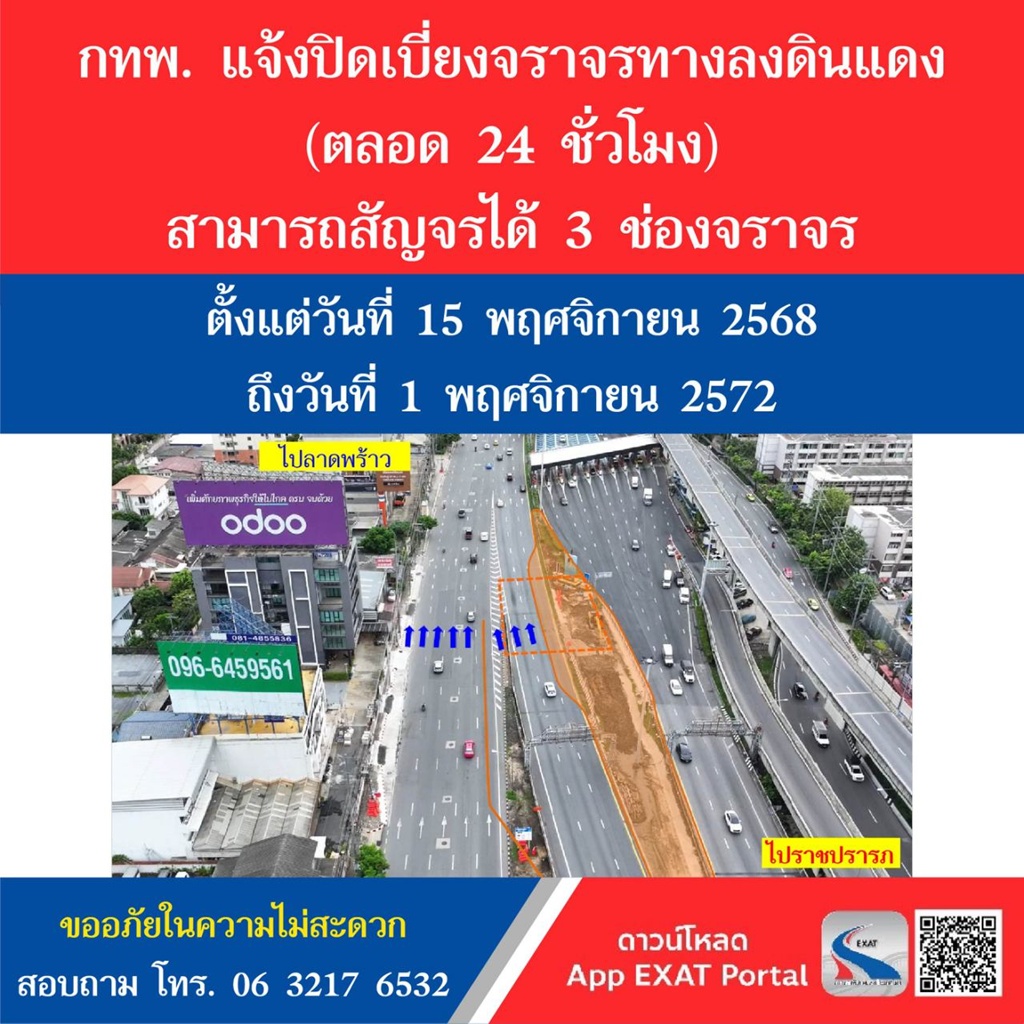การทางพิเศษแห่งประเทศไทย (กทพ.) กระทรวงคมนาคม แจ้งการปิดเบี่ยงการจราจรทางลงดินแดง ทางพิเศษเฉลิมมหานคร ตลอด 24 ชั่วโมง เนื่องด้วยการรถไฟฟ้าขนส่งมวลชนแห่งประเทศไทย (รฟม.) ได้ว่าจ้าง บริษัท ช.การช่าง จำกัด (มหาชน) เป็นผู้รับจ้างดำเนินการก่อสร้างโครงการรถไฟฟ้าสายสีส้ม ช่วงบางขุนนนท์-มีนบุรี (สุวินทวงศ์) จะดำเนินการก่อสร้างปล่องระบายอากาศที่ 6(IVS06) บริเวณทางลงดินแดง ทางพิเศษเฉลิมมหานคร จึงมีความจำเป็นต้องปิดเบี่ยงจราจรบริเวณทางลงดินแดง มุ่งหน้าถนนวิภาวดีรังสิต ตั้งแต่วันที่ 15 พฤศจิกายน 2568 ถึงวันที่ 1 พฤศจิกายน 2572 ตลอด 24 ชั่วโมง โดยสามารถสัญจรได้ 3 ช่องจราจรทั้งนี้ บริษัท ช.การช่าง จำกัด (มหาชน) ได้ติดตั้งป้ายเตือนก่อนถึงพื้นที่ดำเนินการ และติดตั้งป้ายเตือน สัญญาณต่าง ๆ ป้ายประชาสัมพันธ์การเบี่ยงการจราจรเพื่อให้สัญญาณแก่ผู้ใช้ทางพิเศษทราบ