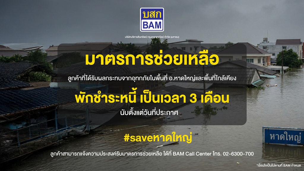 BAM ห่วงใยลูกค้า พนักงาน และชุมชนที่ได้รับผลกระทบจากเหตุการณ์น้ำท่วมในเขตอำเภอหาดใหญ่ และพื้นที่ภาคใต้ พร้อมเร่งตรวจสอบปัญหาต่าง ๆ ของลูกค้าและพนักงาน และเตรียมพิจารณาให้ความช่วยเหลืออย่างเร่งด่วนด้วยมาตรการพักชำระหนี้ 3 เดือน ขึ้นอยู่กับผลกระทบมากน้อย โดยพิจารณาเป็นรายๆ ไป เพื่อบรรเทาความเดือดร้อนทันที