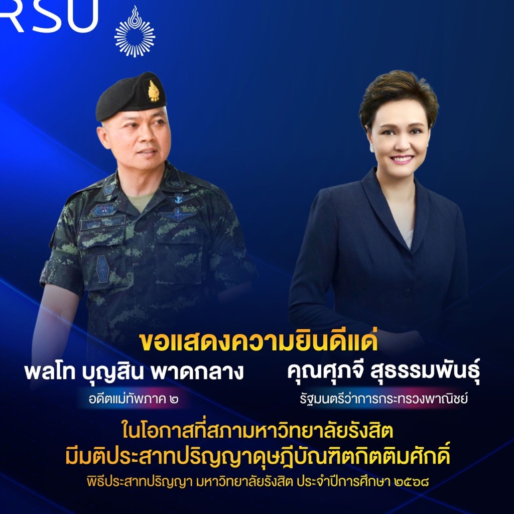 มหาวิทยาลัยรังสิต จัดพิธีประสาทปริญญา ประจำปี 2568 ในวันเสาร์ที่ 6 (ฝึกซ้อม และถ่ายภาพหมู่บัณฑิต) และวันอาทิตย์ที่ 7 ธันวาคม 2568 จัดให้มีพิธีประสาทปริญญา2 ภาค ได้แก่ ภาคเช้า เวลา 07.00 น. – 12.30 น. และภาคบ่าย เวลา 12.30 – 18.30 น. ณ อาคารนันทนาการ โดยได้รับเกียรติจาก ดร.อาทิตย์ อุไรรัตน์ อธิการบดี มหาวิทยาลัยรังสิต เป็นประธานในพิธีมอบปริญญาบัตร ในปีนี้สภามหาวิทยาลัยรังสิต มีมติประสาทปริญญาดุษฎีบัณฑิตกิตติมศักดิ์ แด่ พลโทบุญสิน พาดกลาง อดีตแม่ทัพภาค 2 ศิลปศาสตรดุษฎีบัณฑิตกิตติมศักดิ์ สาขาวิชาผู้นำทางสังคม ธุรกิจ และการเมือง และ คุณศุภจี สุธรรมพันธุ์ รัฐมนตรีว่าการกระทรวงพาณิชย์ ศิลปศาสตรดุษฎีบัณฑิตกิตติมศักดิ์ สาขาวิชาบริหารธุรกิจ
