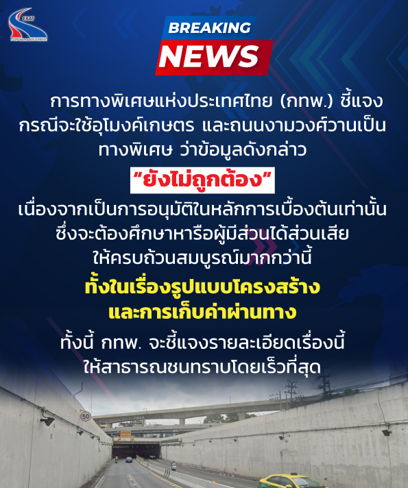 การทางพิเศษแห่งประเทศไทย (กทพ.) ชี้แจงกรณีจะใช้อุโมงค์เกษตร และถนนงามวงศ์วานเป็นทางพิเศษ ว่าข้อมูลดังกล่าวไม่ครบถ้วนจากข้อเท็จจริง โดยยังเป็นการศึกษาเบื้องต้น ซึ่งจะต้องศึกษาให้ครบถ้วนสมบูรณ์มากกว่านี้ อีกทั้งเป็นการอนุมัติในหลักการเบื้องต้นของ คจร.