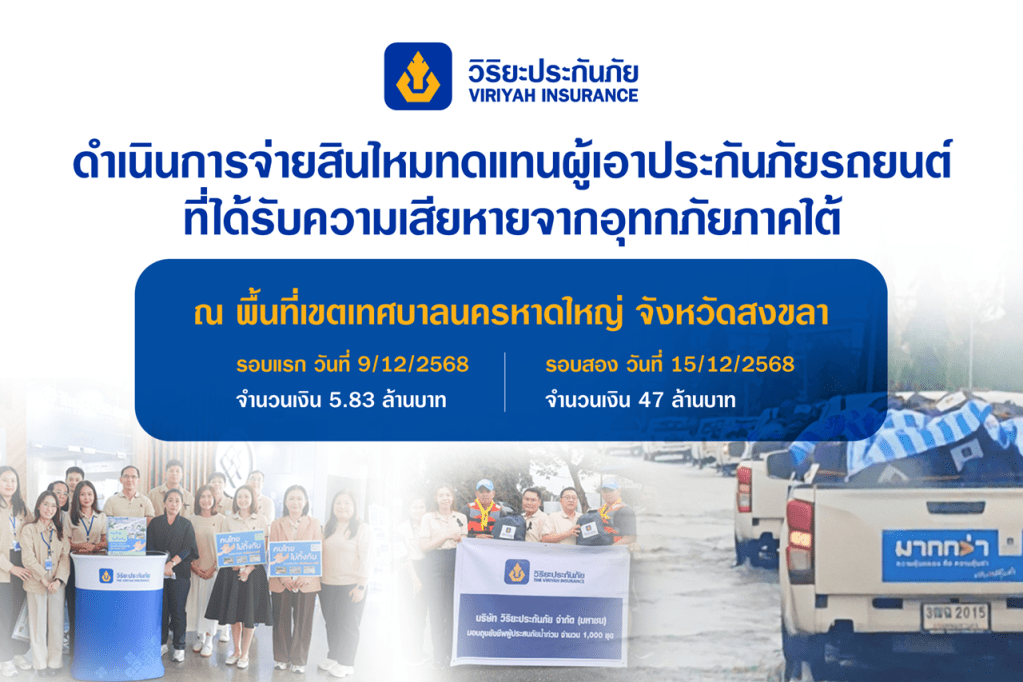 “บริษัทฯ ได้เร่งดำเนินการจ่ายสินไหมทดแทนให้แก่ลูกค้าที่ได้รับผลกระทบอย่างต่อเนื่อง ทั้งนี้ ตามรายงานของศูนย์ปฏิบัติการสินไหมทดแทนวิริยะประกันภัยในพื้นที่ภาคใต้ ณ ปัจจุบัน มีรถยนต์ที่ได้รับความเสียหายจากน้ำท่วมประมาณ 4,300 คัน โดยพื้นที่ที่ได้รับผลกระทบมากที่สุด คือ เขตเทศบาลนครหาดใหญ่ จำนวน 3,800 คัน บริษัทฯ จึงได้ระดมเจ้าหน้าที่ดำเนินงานเร่งรัดตรวจสอบและพิจารณาเอกสารประกอบการเคลมทุกวัน ตลอด 24 ชั่วโมง โดยเบื้องต้นบริษัทฯ ได้ดำเนินการจ่ายสินไหมทดแทนให้แก่ผู้เอาประกันภัย รอบแรก ณ วันที่ 9 ธันวาคม 2568 เป็นการคืนทุนประกันภัยเต็มจำนวนตามที่ระบุไว้ในกรมธรรม์ ซึ่งเป็นรถสันดาปทั้งหมด เป็นเงินจำนวน 5.83 ล้านบาท รอบถัดไปในวันที่ 15 ธันวาคม 2568 สำหรับเคสที่มีเอกสารประกอบการเรียกร้องค่าสินไหมทดแทนครบถ้วน เป็นเงินจำนวน 47 ล้านบาท และจนถึงสิ้นปี 2568 คาดว่าจะจ่ายสินไหมฯ แล้วเสร็จ โดยบริษัทฯ ขอยืนยันความมุ่งมั่นในการดูแลผู้เอาประกันภัยทุกท่านให้ได้รับการชดเชยอย่างครบถ้วน รวดเร็ว และเป็นธรรมสูงสุด” คุณณัฐพงศ์กล่าว