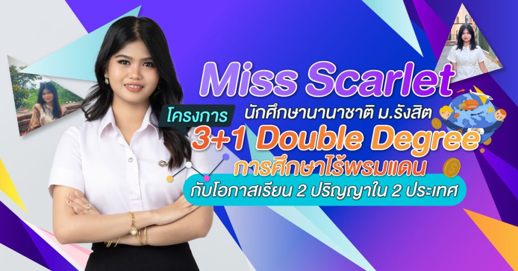 “สการ์เล็ตเรียนจบมัธยมศึกษา จากโรงเรียนเอกชนในเมียนมา ซึ่งเป็นจุดเริ่มต้นที่ทำให้สนใจศึกษาในต่างประเทศ และตัดสินใจเลือกเรียนสาขา International Business เพราะหลงใหลในความเชื่อมโยงของตลาดโลก และอยากเข้าใจวิธีการบริหารธุรกิจข้ามประเทศ อยากไล่ตามความรู้ด้านการเงิน และมหาวิทยาลัยรังสิตเองก็ตอบโจทย์ทุกอย่าง เมื่อได้รู้จักโครงการ 3+1 Double Degree ความร่วมมือระหว่างมหาวิทยาลัยรังสิต และ UWE Bristol ประเทศอังกฤษ ความตั้งใจของเราก็ชัดเจนยิ่งขึ้น และตื่นเต้นมากๆ ที่จะได้มีโอกาสเรียนสองประเทศและได้สองปริญญา นี่เป็นก้าวสำคัญทั้งด้านการศึกษาและการพัฒนาตัวเอง ที่จะได้เรียนรู้การสอนแบบสหราชอาณาจักร และพร้อมจะท้าทายตัวเองเพื่ออนาคตที่ดีกว่า ประสบการณ์ที่ได้จาก ม.รังสิต สการ์เล็ตประทับใจมากค่ะ อาจารย์ช่วยสอนปูพื้นฐานความรู้ด้านธุรกิจโลก อธิบายละเอียดด้านทักษะการคิดวิเคราะห์ ที่สำคัญบรรยากาศของมหาวิทยาลัย อบอุ่น แต่ก็มีความเป็นนานาชาติ ทำให้ฉันกล้าพูดภาษาอังกฤษและสื่อสารกับคนหลากหลายวัฒนธรรม”
