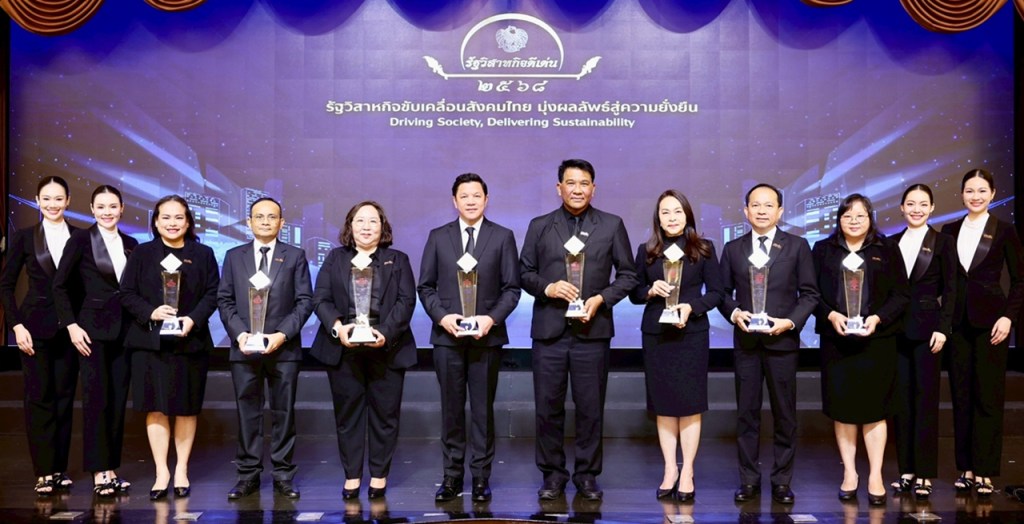 นายเอกนิติ นิติทัณฑ์ประภาศ รองนายกรัฐมนตรีและรัฐมนตรีว่าการกระทรวงการคลัง มอบรางวัลรัฐวิสาหกิจดีเด่น (SOE Awards) ประจำปี 2568 ให้แก่ธนาคารออมสิน โดยมีผู้แทนรับมอบรางวัลได้แก่