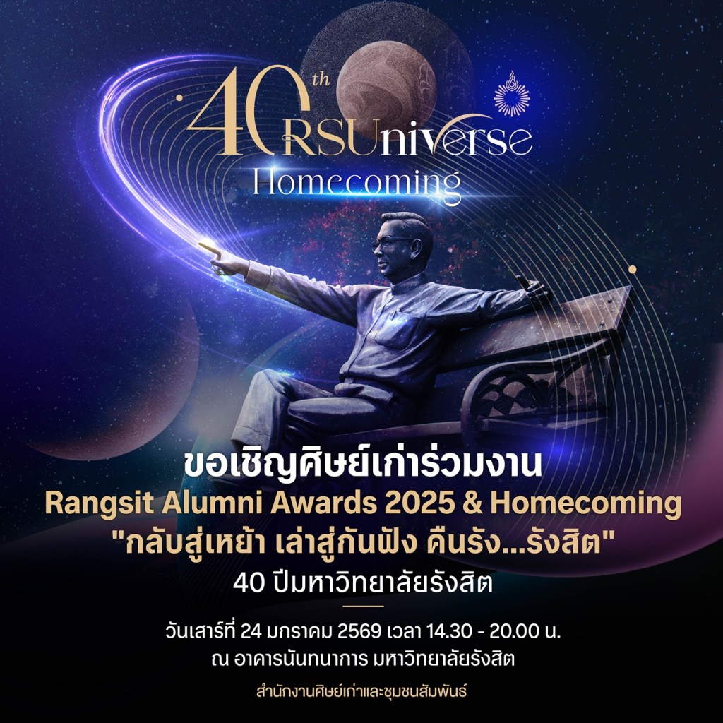 สำนักงานศิษย์เก่าและชุมชนสัมพันธ์ มหาวิทยาลัยรังสิต ขอเชิญชวนศิษย์เก่ามหาวิทยาลัยรังสิตร่วมงานวันเชิดชูศิษย์เก่าประจำปี 2568 (Rangsit Alumni Awards 2025 & Homecoming) ภายในงานจัดให้มีการมอบรางวัล อาทิ รางวัลศิษย์เก่าดีเด่น รางวัลศิษย์เก่ายอดเยี่ยม ระดับปริญญาตรี ปริญญาโท และปริญญาเอก รางวัลศิษย์เก่าผู้สร้างแรงบันดาลใจ การแสดง กิจกรรมพบปะศิษย์เก่ารังสิต “กลับสู่เหย้า เล่าสู่กันฟัง คืนรัง…รังสิต” เพื่อนำไปสู่การสร้างสรรค์โครงการและกิจกรรมที่เป็นประโยชน์ระหว่างศิษย์เก่าและมหาวิทยาลัยรังสิต RSU Family Networks ทั้งนี้ งานวันเชิดชูศิษย์เก่าประจำปี 2568 จะจัดขึ้นในวันเสาร์ที่ 24 มกราคม 2569 เวลา 13.00 – 22.00 น. ณ อาคารนันทนาการ มหาวิทยาลัยรังสิต ศิษย์เก่ามหาวิทยาลัยรังสิตสนใจร่วมงาน โทร 02 – 9972220-30 ต่อ 3907, 3908