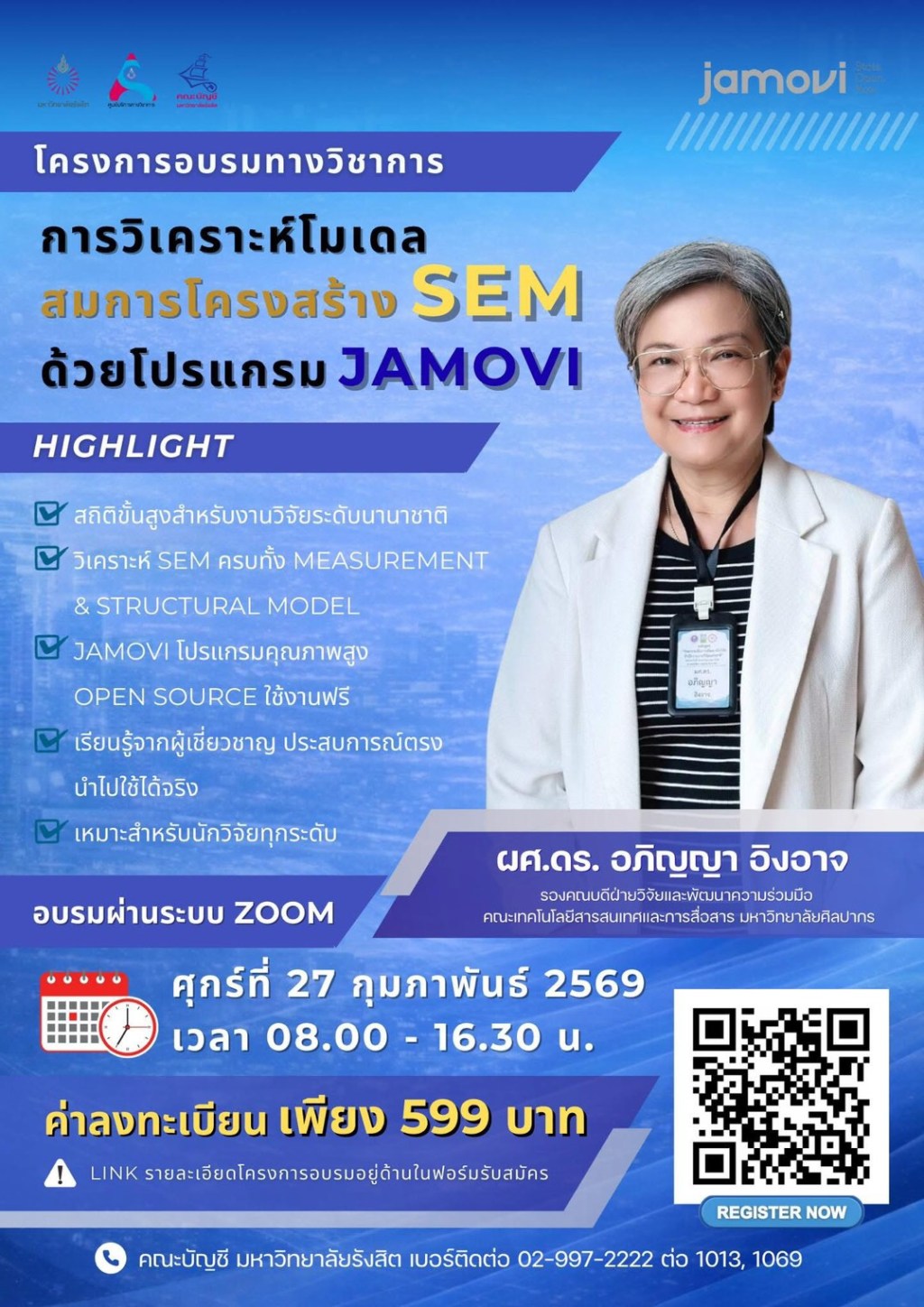 คณะบัญชี มหาวิทยาลัยรังสิต ขอเชิญเข้าร่วมอบรมทางวิชาการออนไลน์เรื่อง “การวิเคราะห์โมเดลสมการโครงสร้าง (SEM) ด้วยโปรแกรม JAMOVI” อบรมเชิงปฏิบัติการที่ช่วยยกระดับงานวิจัยในวันศุกร์ที่ 27 กุมภาพันธ์ พ.ศ. 2569เวลา 08.00–16.30 น.โดยอบรมผ่านระบบ ZOOM Meeting