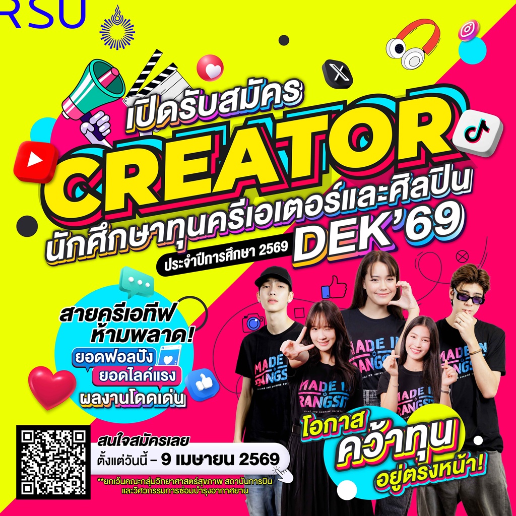 มหาวิทยาลัยรังสิต เปิดรับสมัครนักศึกษาทุนความสามารถพิเศษด้านครีเอเตอร์และศิลปิน ประจำปีการศึกษา 2569 ตั้งแต่บัดนี้จนถึงวันที่ 9 เมษายน 2569 โดยผู้ที่ผ่านการคัดเลือกจะได้รับการยกเว้นค่าหน่วยกิตและค่าบำรุงการศึกษา จำนวน 10 ทุน มีคุณสมบัติดังนี้