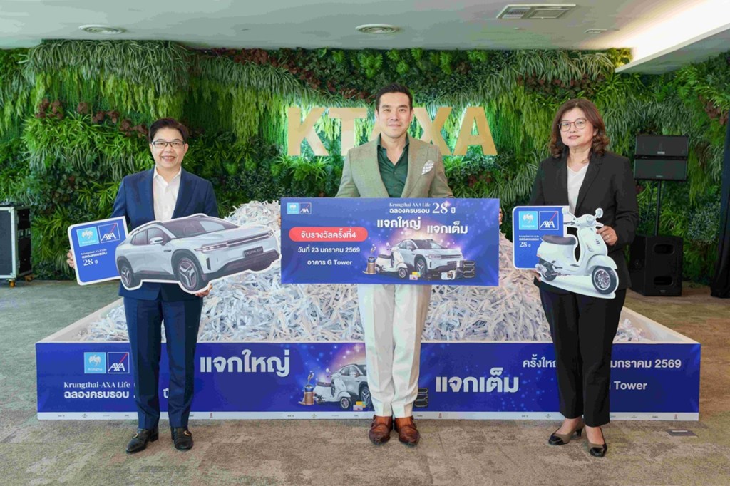 บมจ.กรุงไทย-แอกซ่า ประกันชีวิต นำโดยคุณณัฐพิสิษฐ์ ครุฑครองชัย ประธานเจ้าหน้าที่บริหาร (คนกลาง) พร้อมด้วย คุณบุปผาวดี โอวรารินท์ ประธานเจ้าหน้าที่บริหาร ฝ่ายการตลาด (คนซ้าย) และคุณคุณทิพาพันธ์ เฟื่องปัญญา ประธานเจ้าหน้าที่บริหาร ฝ่ายปฏิบัติการ (คนขวา) จับรายชื่อลูกค้าผู้โชคดีลุ้นรางวัลใหญ่ ภายใต้แคมเปญพิเศษ “ฉลองครบรอบ 28 ปี กรุงไทย-แอกซ่า แจกใหญ่ แจกเต็ม” ซึ่งรางวัลใหญ่ในครั้งนี้ ได้แก่ รถยนต์ DEEPAL E07 Performance AWD มูลค่า 1,999,000 บาท (จำนวน 1 รางวัล) รถจักรยานยนต์ Vespa LX 150 i-GET ABS มูลค่ารางวัลละ 89,900 บาท (จำนวน 3 รางวัล) รวมถึงโทรศัพท์มือถือไอโฟน และไอแพด รวมมูลค่ารางวัลกว่า 7 ล้านบาท โดยแคมเปญดังกล่าวจัดขึ้นเพื่อแทนคำขอบคุณลูกค้าคนสำคัญที่ไว้วางใจให้บริษัทฯ ได้ดูแลให้ความคุ้มครองตลอดมา ทั้งนี้บริษัทฯ ได้ประกาศรายชื่อผู้โชคดีผ่านทางเว็บไซต์ของบริษัทhttps://www.krungthai-axa.co.th/th/luckydraw-2025-r4-announcement โดยลูกค้าผู้โชคดีจากแคมเปญดังกล่าวจะได้รับการติดต่อผ่านทางโทรศัพท์จากผู้แทนบริษัทฯ เพื่อแจ้งรายละเอียดและยืนยันการรับสิทธิ์