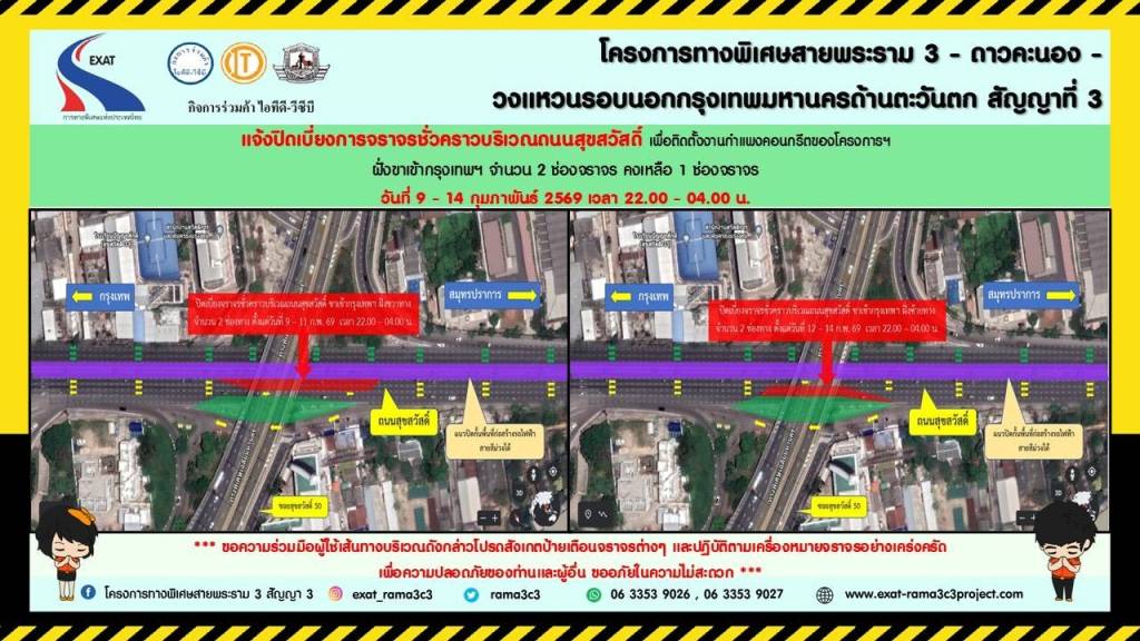 การทางพิเศษแห่งประเทศไทย (กทพ.) กระทรวงคมนาคมได้ว่าจ้าง กิจการร่วมค้า ไอทีดี-วีซีบี (ITD-VCB Joint Venture) ประกอบด้วย บริษัท อิตาเลียนไทย ดีเวล๊อปเมนต์ จำกัด (มหาชน) และบริษัท วิจิตรภัณฑ์ก่อสร้าง จำกัด เป็นผู้รับจ้างดําเนินการก่อสร้าง โครงการทางพิเศษสายพระราม3 – ดาวคะนอง – วงแหวนรอบนอกกรุงเทพมหานครด้านตะวันตกสัญญาที่ 3 โดยผู้รับจ้างจะดำเนินการติดตั้งกำแพงคอนกรีตของโครงการทางพิเศษดังกล่าว จึงมีความจำเป็นจะต้องปิดเบี่ยงการจราจรชั่วคราว บริเวณถนนสุขสวัสดิ์ ฝั่งขาเข้าและขาออกกรุงเทพฯ จำนวน 2 ช่องจราจร คงเหลือ 1 ช่องจราจร โดยมีรายละเอียด ดังนี้