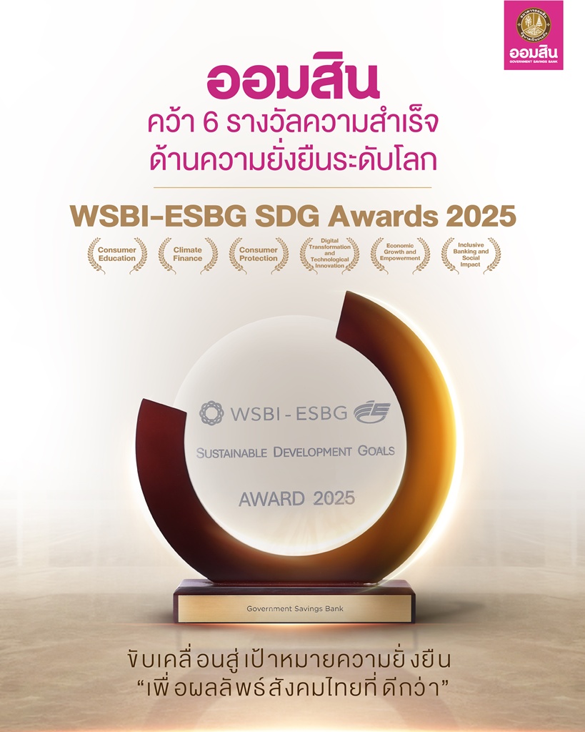 นางลภาวรรณ จันทร์กระจ่าง รองผู้อำนวยการธนาคารออมสิน รักษาการแทนผู้อำนวยการธนาคารออมสิน เปิดเผยว่า ธนาคารประสบความสำเร็จได้รับรางวัล WSBI-ESBG SDG Awards 2025 เวทีรางวัลด้านความยั่งยืนระดับโลกซึ่งจัดขึ้นเป็นครั้งแรก โดยธนาคารออมสินเป็นองค์กรที่ได้รับรางวัลมากที่สุดในปีนี้ สะท้อนความโดดเด่นของการดำเนินงานที่บูรณาการหลัก ESG เข้ากับยุทธศาสตร์การเป็น “ธนาคารเพื่อสังคม” อย่างเป็นรูปธรรม ครอบคลุมมิติสังคม สิ่งแวดล้อม และเศรษฐกิจ สอดคล้องกับเป้าหมายการพัฒนาที่ยั่งยืน (SDGs) ขององค์การสหประชาชาติ โดยได้รับรางวัลรวมทั้งสิ้น 6 สาขา ได้แก่ Consumer Education, Climate Finance, Consumer Protection, Digital Transformation and Technological Innovation, Economic Growth and Empowerment, Inclusive Banking and Social Impact ทั้งนี้ รางวัลดังกล่าวจัดขึ้นโดย World Savings and Retail Banking Institute และ European Savings and Retail Banking Group (WSBI-ESBG) เพื่อเชิดชูผลงานของสถาบันการเงินที่มีความโดดเด่นด้านการขับเคลื่อนการธนาคารอย่างครอบคลุม (Inclusive) ยั่งยืน (Sustainable) และมีความรับผิดชอบ (Responsible) ผ่านนวัตกรรมและโซลูชันทางการเงินที่รองรับการเปลี่ยนผ่านสู่ดิจิทัล และสร้างผลลัพธ์เชิงบวกต่อสังคมอย่างแท้จริง คัดเลือกจากสมาชิกทั้งหมดกว่า 76 ประเทศ ใน 5 ทวีปทั่วโลก