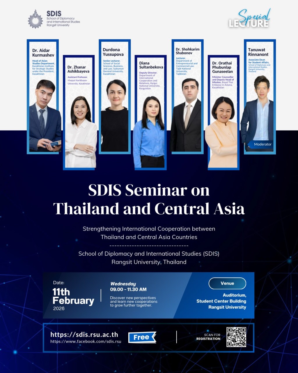 คณะการทูตและการต่างประเทศ มหาวิทยาลัยรังสิต ร่วมกับสถานเอกอัครราชทูตไทย ประจำกรุงอัสตานา สาธารณรัฐคาซัคสถาน จัดงานเสวนาวิชาการ SDIS SEMINAR 2026 (EP.1) หัวข้อ “Thailand and Central Asia : Strengthening International Cooperation between Thailand and Central Asian Countries” ในวันพุธที่ 11 กุมภาพันธ์ 2569 เวลา 09.00–11.30 น. ณ ห้องออดิทอเรียม อาคาร Student Center (อาคาร 6) มหาวิทยาลัยรังสิต เพื่อเปิดโอกาสให้ผู้เข้าร่วมได้รับฟังมุมมองเชิงลึกเกี่ยวกับความร่วมมือระหว่างประเทศไทยกับประเทศในภูมิภาคเอเชียกลาง จากนักวิชาการและผู้เชี่ยวชาญด้านการทูตจากหลากหลายประเทศ ภายในงานได้รับเกียรติจากผู้ร่วมอภิปราย ได้แก่ Kurmashev Aidar Kenzhebekovich, Ph.D. (KazISS under the President of the Republic of Kazakhstan), Zhanar Ashikbayeva, Ph.D.