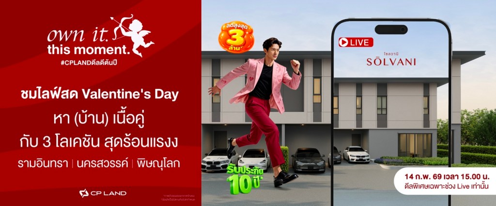 9 กุมภาพันธ์ 2569, กรุงเทพฯ — บริษัท ซี.พี. แลนด์ จำกัด (มหาชน) หรือ CP LAND ผู้พัฒนาอสังหาริมทรัพย์ชั้นนำของประเทศไทย เดินหน้าเขย่าตลาดอสังหาฯ ต้นปี ต่อยอดความสำเร็จแคมเปญหลัก “own it. this moment. #CPLANDดีลดีต้นปี” ด้วยการส่งแคมเปญย่อยสุดเอ็กซ์คลูซีฟต้อนรับเทศกาลแห่งความรัก ผ่านกิจกรรม Live Event ชวนคนร่วมตามหา “บ้านเนื้อคู่” หลังใหม่ ในบรรยากาศที่เหนือระดับแต่เป็นกันเอง พร้อมสัมผัสรายละเอียดงานดีไซน์และฟังก์ชันการอยู่อาศัยจริงผ่านหน้าจอ เพื่อมอบข้อเสนอที่ดีที่สุดที่มีเฉพาะช่วง Live เท่านั้น ในวันที่ 14 กุมภาพันธ์นี้