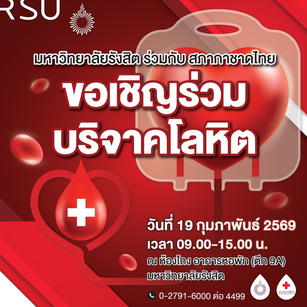 สำนักงานสวัสดิการสุขภาพ คลินิกเวชกรรม มหาวิทยาลัยรังสิต ร่วมกับ สภากาชาดไทย ขอเชิญผู้ที่สนใจร่วมบริจาคโลหิต ในวันที่ 19 กุมภาพันธ์ 2569 เวลา 09.00-15.00 น. ณ ห้องโถง อาคารหอพัก (ตึก 9A) มหาวิทยาลัยรังสิต