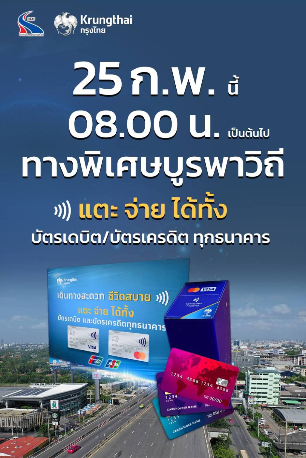 การทางพิเศษแห่งประเทศไทย (กทพ.) กระทรวงคมนาคม ขอแจ้งให้ผู้ใช้ทางพิเศษทราบว่า ตั้งแต่วันที่ 25 กุมภาพันธ์ 2569 เวลา 08.00 น. เป็นต้นไป ผู้ใช้บริการทางพิเศษบูรพาวิถีสามารถชำระค่าผ่านทางด้วยบัตรเดบิตและบัตรเครดิตแบบไร้สัมผัส (EMV Contactless) ได้แล้ว ครอบคลุม 18 ด่าน รวม 50 ช่องทาง โดยรองรับบัตรจากทุกธนาคาร ทั้ง Visa, Mastercard, JCB และ UnionPay
