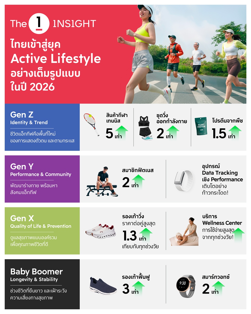 The 1 Insight เผยเทรนด์หลักแห่งปี 2026 Active Lifestyle หรือรูปแบบการใช้ชีวิตที่ให้ความสำคัญกับการเคลื่อนไหวร่างกายเพื่อสุขภาพ หนึ่งใน Big Shift ด้านพฤติกรรมผู้บริโภคระดับโลกปี 2026 สะท้อนผ่านการเติบโตของสินค้าและบริการด้านสุขภาพ กีฬา และการดูแลร่างกายในระยะยาว พร้อมเจาะลึก mindset ของผู้บริโภคในแต่ละช่วงวัย โดยพบว่า Gen Z เน้นหาพื้นที่ใหม่ในการแสดงตัวตนและตามกระแส (Identity & Trend), Gen Y พัฒนาร่างกายและมองหาสังคมแอ็กทีฟ (Performance & Community) ขณะที่ Gen X ให้ความสำคัญกับการดูแลสุขภาพแบบองค์รวมเพื่อคุณภาพชีวิตที่ดี (Quality of Life & Mobility) และ Baby Boomers เน้นดูแลสุขภาพเพื่อช่วงชีวิตที่ยืนยาวและเฝ้าระวังความเสี่ยงทางสุขภาพ (Longevity & Stability)
