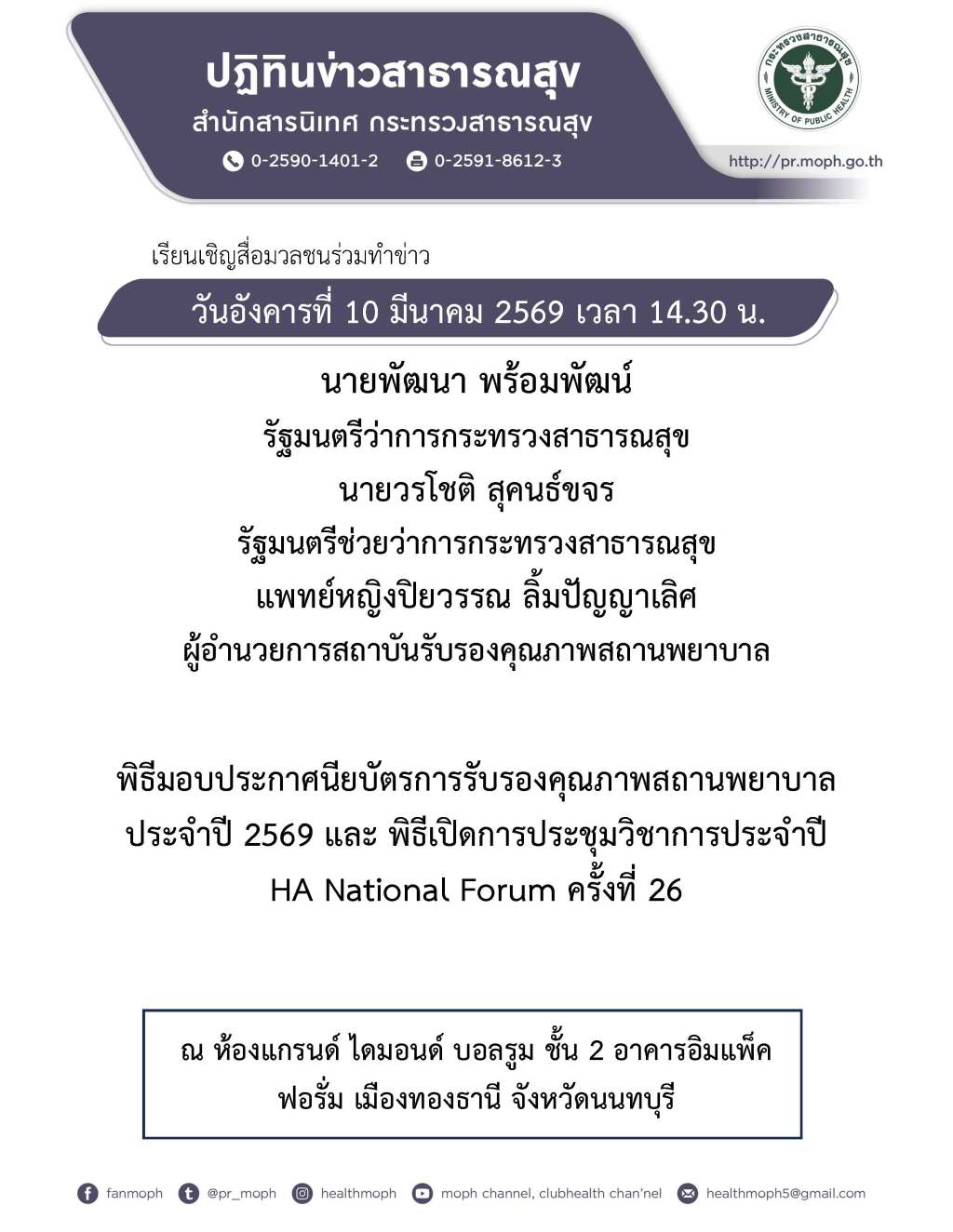 กระทรวงสาธารณสุข เชิญร่วมงานพิธีมอบประกาศนียบัตรการรับรองคุณภาพสถานพยาบาลประจำปี 2569 และ พิธีเปิดการประชุมวิชาการประจำปี HA National Forum ครั้งที่ 26 ณ ห้องแกรนด์ ไดมอนด์ บอลรูม ชั้น 2 อาคารอิมแพ็คฟอรั่ม เมืองทองธานี จังหวัดนนทบุรี