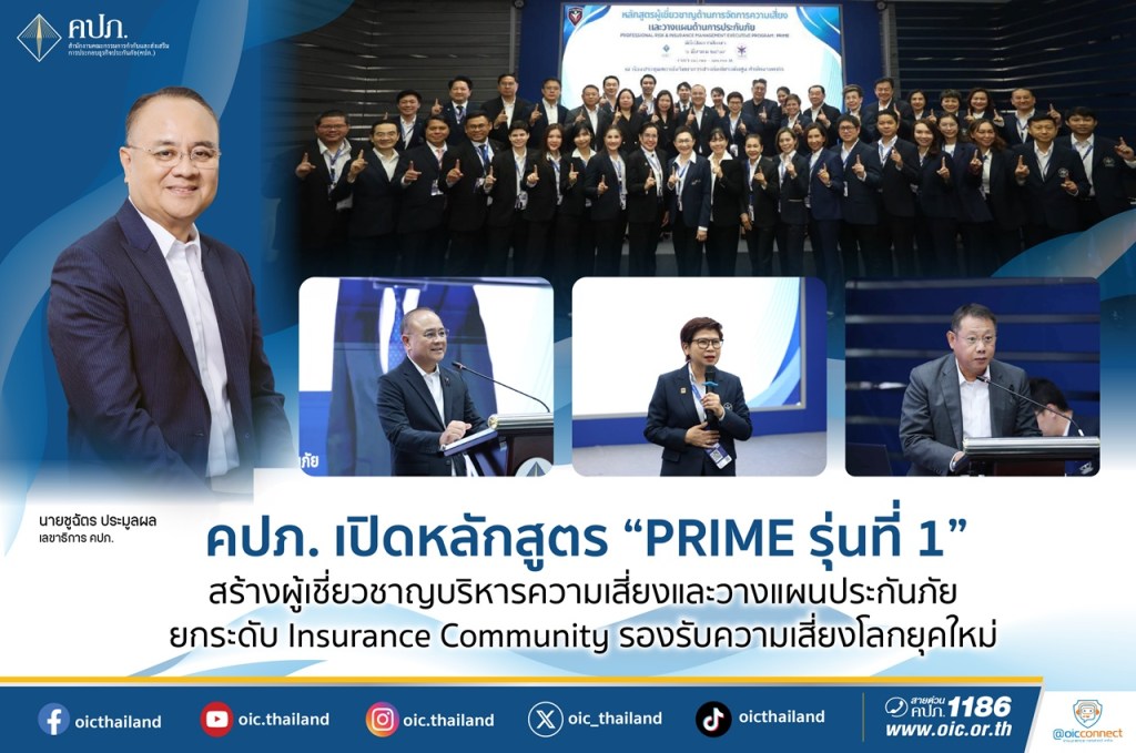 เมื่อวันที่ 6 มีนาคม 2569 สำนักงานคณะกรรมการกำกับและส่งเสริมการประกอบธุรกิจประกันภัย (สำนักงาน คปภ.) จัดพิธีเปิดการศึกษาอบรม หลักสูตรผู้เชี่ยวชาญด้านการจัดการความเสี่ยงและวางแผนด้านการประกันภัย (Professional Risk and Insurance Management Expert Program : PRIME) รุ่นที่ 1 โดยมีนายชูฉัตร ประมูลผล เลขาธิการคณะกรรมการกำกับและส่งเสริมการประกอบธุรกิจประกันภัย (เลขาธิการ คปภ.) เป็นประธานในพิธีเปิด พร้อมด้วยผู้บริหารสำนักงาน คปภ. ผู้บริหารสมาคมตัวแทนประกันชีวิตและที่ปรึกษาการเงิน สื่อมวลชน และผู้รับการอบรม เข้าร่วมในพิธี ณ สถาบันวิทยาการประกันภัยระดับสูง สำนักงาน คปภ. ถนนรัชดาภิเษก กรุงเทพมหานคร