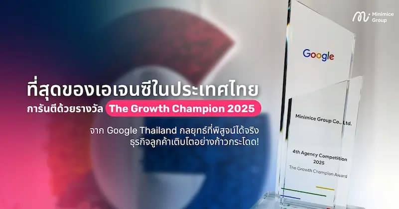 รางวัล Agency Excellence Awards Winner จาก Google Thailand คือ ความเชี่ยวชาญเหนือระดับของ Minimice Group ในการใช้โซลูชันและเครื่องมือชาญฉลาดจาก Google เพื่อสร้างผลลัพธ์ทางธุรกิจที่พิสูจน์ได้จริง โดยรางวัลในสาขา The Growth Champion 2025 ถือเป็นหนึ่งในรางวัลที่คว้ามาได้ยากที่สุด เนื่องจากเป็นการเชือดเฉือนกันโดยตรงระหว่าง Top 10 เอเจนซีชั้นนำในประเทศไทย ซึ่ง Google จะพิจารณาจากเกณฑ์อันเข้มงวดรอบด้าน ทั้งประสิทธิภาพการบริหารแคมเปญ ความสามารถในการขยายฐานลูกค้า และผลตอบแทน (ROI) ที่ลูกค้าได้รับจริง ท่ามกลางการแข่งขันที่ดุเดือดที่สุดของเหล่าเอเจนซีในไทย Minimice Group ก็ได้คว้ารางวัลตำแหน่งผู้ชนะอันดับ 1 มาครองได้สำเร็จ ในฐานะเอเจนซีที่มีอัตราการเติบโตสูงสุดในประเทศไทย โดยวัดจากมูลค่าการใช้จ่ายโฆษณา (Ads Spend) และเปอร์เซ็นต์การเติบโตแบบปีต่อปี (YoY Growth) ที่สูงที่สุด เหนือกว่าทุกรายในกลุ่มผู้เข้าชิง การได้รับเลือกให้เป็นผู้ชนะในสาขานี้จึงเป็นการพิสูจน์ว่า Minimice Group คือ หนึ่งในเอเจนซีระดับท็อปของประเทศไทยที่สามารถเปลี่ยน ‘งบประมาณการตลาด’ ของลูกค้าให้กลายเป็นยอดขาย ผลกำไร และเติบโตได้อย่างมีคุณภาพ