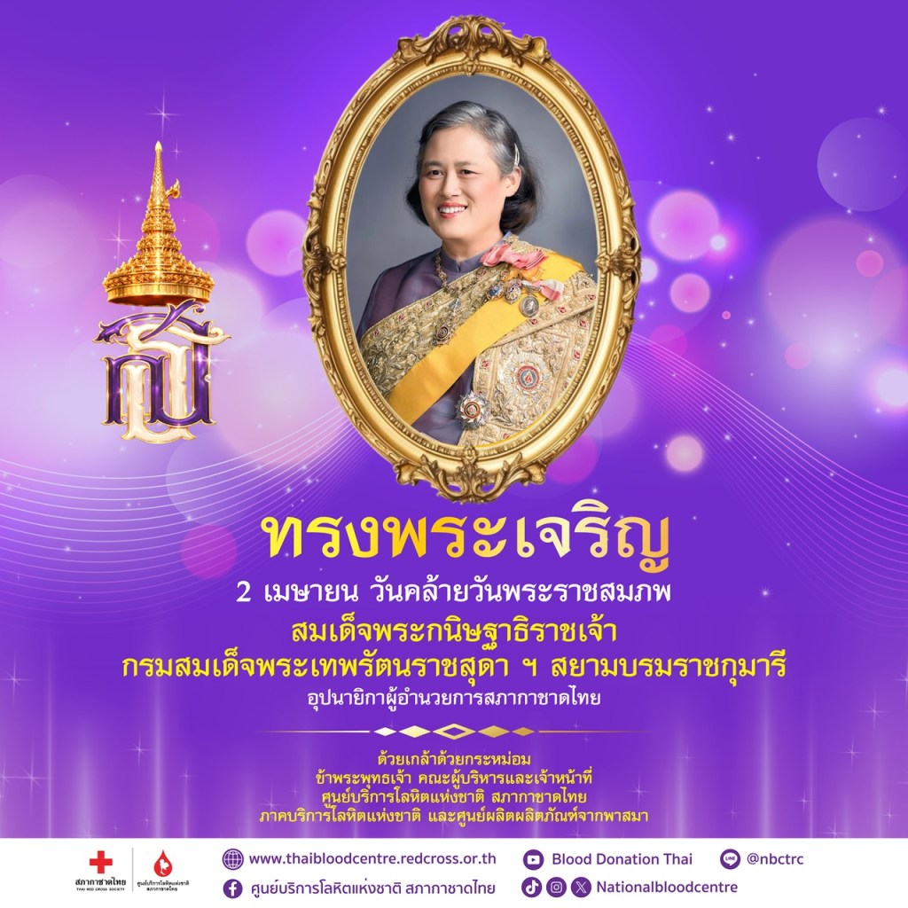 ศูนย์บริการโลหิตแห่งชาติ สภากาชาดไทย เชิญชวนพสกนิกรชาวไทย ร่วมสืบสานพระราชปณิธานแห่งการให้ ทำความดีบริจาคโลหิต ในโครงการ “เรารักกรมสมเด็จพระเทพ ฯ” เพื่อถวายเป็นพระราชกุศล แด่สมเด็จพระกนิษฐาธิราชเจ้า กรมสมเด็จพระเทพรัตนราชสุดา ฯ สยามบรมราชกุมารี เนื่องในโอกาส ทรงเจริญพระชนมายุ 71 พรรษา 2 เมษายน 2569 ตลอดเดือนเมษายน 2569 ณ ศูนย์บริการโลหิตแห่งชาติ หน่วยรับบริจาคโลหิตประจำที่ (Fixed Station) ภาคบริการโลหิตแห่งชาติ 12 แห่ง ทั่วประเทศ และโรงพยาบาลสาขาบริการโลหิตแห่งชาติ ทั่วประเทศ