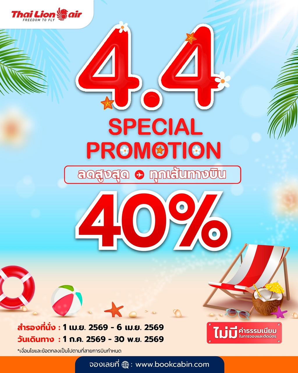 สายการบินไทย ไลอ้อน เเอร์ จัดโปรโมชันพิเศษ 4.4 ลดสูงสุด 40% ให้ผู้โดยสารเดินทางท่องเที่ยวกับราคาโปรโมชันสุดคุ้ม ทั้งเส้นทางบินในประเทศและต่างประเทศ สามารถสำรองที่นั่งได้ในวันที่ 1 – 6 เมษายน 2569 และเริ่มเดินทางได้ตั้งแต่ 1 กรกฎาคม 2569 – 30 พฤศจิกายน 2569